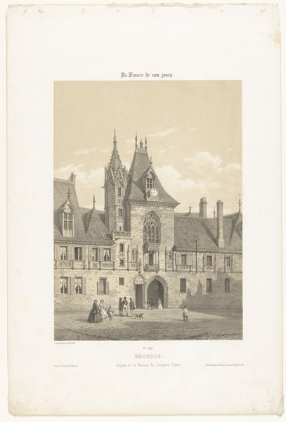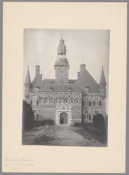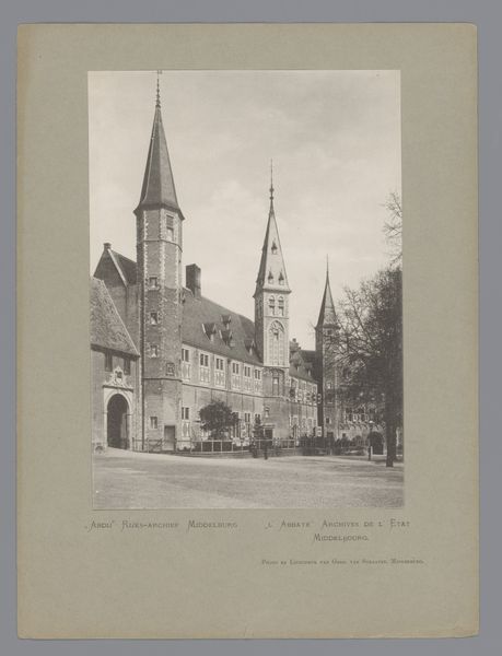 Curator: Let’s consider this photographic print, “Gezicht op de archiefgebouwen aan het Abdijplein van de Abdij van Middelburg,” placing us before the archive buildings at Middelburg Abbey, captured after 1906 by C. Aubry Fils. What strikes you immediately? Editor: Well, that's quite a mouthful of a title! Jokes aside, there's a palpable sense of… gloom. I’m getting historical vibes; all those soaring towers casting shadows. It looks serious. Does it feel serious to you? Curator: I see what you mean. I think the gravitas of the image connects directly with the Abbey’s historical role—its place as a site of religious and political authority through the centuries is written in its architectural language. The absence of bustling crowds, the lone figures... that silence feels heavy. Editor: Heavy indeed. I wonder about those lone figures you mentioned. Are they going about important business? Maybe the somber tones of the image make it hard to really imagine. It's all greys and browns; the antithesis of vibrancy. I can see where the abbey buildings stand. Why highlight them? Curator: Aubry, in a way, memorializes institutional memory through architecture. The archive building housed important records and deeds—legacies, even— of prominent families and local government. So this image functions, in part, as a statement about historical power structures and who gets to write that history. This relates to concepts of spatial justice and representation within archives. Editor: Ah, so we're really talking about power dynamics being built into the very stones here, in this image as well. Like the very buildings are trying to look imposing! The photographer obviously also found it of significance. This image really makes you think, huh? About legacy, who creates it, who's in charge... Curator: Precisely. Aubry Fils allows us a lens to dissect those narratives encoded in the stones—narratives often excluding or misrepresenting marginalized communities. It encourages a visual interrogation into whose stories are centered, and whose are silenced, within these historical and architectural behemoths. Editor: A silence that's deafening now that you point it out! Gosh, I was just struck by the light and dark when I began, but you really gave me so much to ponder about the social context and deeper layers woven in, don't you think? Thank you for your insight! Curator: You've shifted my perspective as well. Paying more attention to what my intuitive responses say has definitely improved how I analyse works, especially after considering how certain historical contexts influence our perspectives. It has really helped in my line of work. Thank you!