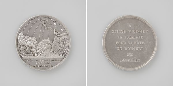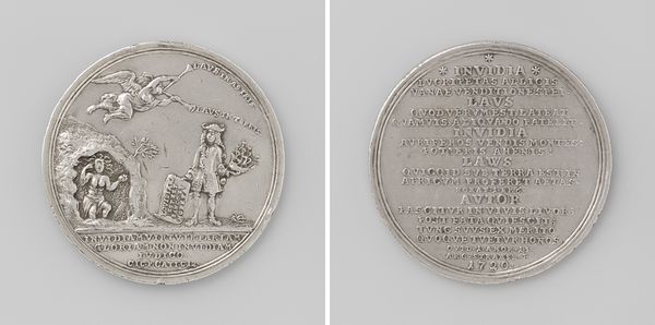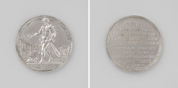 Editor: This is a metal engraving titled "Vijfentwintigjarige huwelijk van Jan Frederik Sluyter en Charlotte Amelia Slebosch," created in 1764. It looks like a commemorative coin or medallion. The design feels very classical, but also celebratory. What do you see in this piece, especially considering its historical context? Curator: It’s a fascinating object. While ostensibly celebrating a 25th wedding anniversary, this medal offers a glimpse into 18th-century societal expectations and the role of marriage in solidifying social and economic structures. Look at the imagery. A child appears central, suggesting a continuation of lineage and the family name. Doesn’t this strike you as highlighting the importance of inheritance and societal stability within the domestic sphere? Editor: I do see that now. I hadn't initially thought about the medal in terms of social structure. Were these sorts of objects common among the upper classes at the time? Curator: Exactly. Objects like this weren't mere sentimental keepsakes; they were deliberate markers of status and lineage. The Rococo style itself, with its delicate ornamentation and emphasis on leisure, speaks to a specific class and their worldview. Consider also, how the woman is rendered in name only. Why do you think Sluyter’s accomplishments are more important to commemorate in the artistic representation? Editor: That's a great point! Maybe because in that society, only men of nobility had agency and power outside of the domestic sphere? Curator: Precisely! What we must keep at the forefront is understanding this object as reflecting societal ideals rather than actual experiences. Editor: That definitely shifts my understanding of it. I'll never see commemorative art quite the same way again! Curator: Good, then let us question the intentions, assumptions, and sociohistorical context of this piece to learn more about this bygone era.