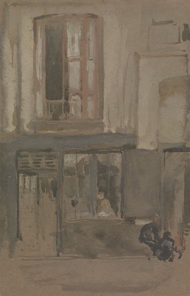 Editor: This is James McNeill Whistler's "A Shop with a Balcony," painted in 1899. It appears to be rendered in oil paint and possibly watercolor, depicting a somewhat blurred cityscape. What's interesting is the way the materials create such a transient, almost dreamlike quality. How do you interpret this work? Curator: As a materialist, I see this work primarily through the lens of its production. The choice of oil and watercolor isn't accidental. The rapid drying time of watercolor allows for capturing immediate impressions, fitting into the late 19th-century fascination with modern, urban life and its inherent ephemerality. How does Whistler use these materials to convey the labor or economic aspects of the shop scene? Editor: It's hard to tell precisely what’s being sold; it feels secondary to the scene's ambiance. You don’t get a sense of labor in a conventional way. Curator: Exactly. But the visible brushstrokes, the blurring – they're all *labor*, Whistler's physical engagement with the materials. He's also implicitly commenting on a changing consumer culture. Shops became aesthetic displays as much as places of necessity. The “shop” is more of a facade than a source of goods. Editor: So the materiality emphasizes the shifting social context around labor and consumerism? The shop becomes part of the overall sensory experience of city life, rather than just a place of business? Curator: Precisely. By foregrounding the material process, Whistler reveals the subtle transformation of urban spaces within the context of emerging capitalism and visual consumption. What's “real” here, the shop or Whistler's artistic mediation? Editor: That's a great point! I hadn't thought about how the medium itself highlights those societal shifts. I see how his particular artistic labor reframes our understanding of daily commerce. Thank you.