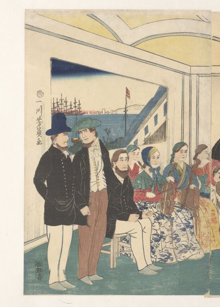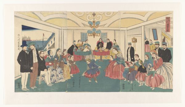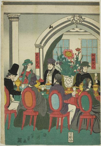 This is a woodblock print titled ‘A Foreign Residence in Yokohama’, crafted by Utagawa Yoshikazu in the 19th century. Immediately, the objects within the image tell a story. A chandelier hangs prominently, illuminating the scene. The chandelier, originating in medieval churches and royal courts, symbolizes wealth, enlightenment, and celebration. We see it repeatedly throughout history, from grand halls of European castles to modern depictions of luxurious interiors. Yet, its presence here, within a Japanese print depicting a foreign residence, creates a fascinating cross-cultural dialogue. It underscores the mingling of Eastern and Western aesthetics and values. The light emanating from the chandelier suggests a beacon—perhaps, representing the allure and transformative power of foreign influence on Japanese society. It speaks to the psychological impact of cultural exchange, where familiar symbols take on new, nuanced meanings within different cultural contexts. This symbol, far from being static, evolves, resurfaces, and takes on new meanings in the continuous dance of cultural interaction.