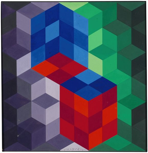 Victor Vasarely created this mind-bender, "Torony," with paint, though it feels like it could be made of light. The colors are laid down in a tight grid, like pixels, each one nudging the next into a slightly different hue. The surface is so smooth, it almost disappears. You don't see brushstrokes, just pure, unadulterated color doing its thing. It's like Vasarely is saying, "Forget the hand, focus on the eye." I love how the green pops, acting as a visual anchor in all this shifting perspective. It's a reminder that even in a world of illusion, there's always a solid ground, a place to start. Vasarely reminds me a little of Bridget Riley, another artist who messed with perception. But where Riley goes for the dizzying effect, Vasarely is more about creating a sense of wonder, a feeling that anything is possible. It's like he's inviting us to question everything we think we know about space and form.