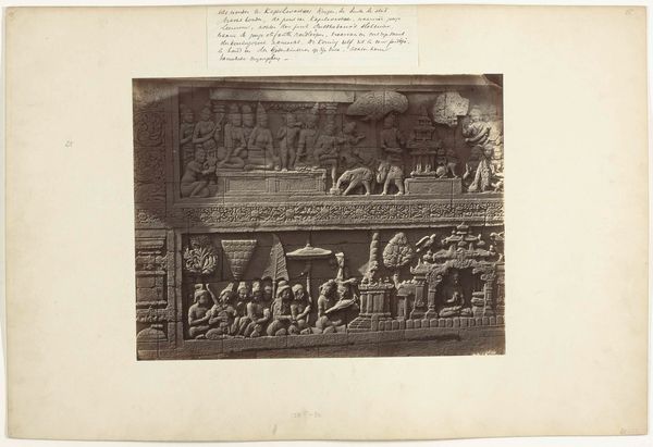 This is a photograph of a bas-relief from Borobudur, near Magelang in what was then called the Dutch East Indies, and it was taken by Onnes Kurkdjian. What strikes me is how Kurkdjian composes the shot. He emphasizes the relief's horizontal bands and dense accumulation of carved figures. This isn’t about empty space; it's about fullness, about carving into the stone until it becomes this textured tapestry. See how the light catches the edges of each figure, defining its shape but also blending it into the overall pattern. The photograph captures a certain moment in time, but it also connects us to the original makers of the relief. You can almost feel the weight of the stone and the patient hands that shaped it. The deep undercuts create bold contrasts, and a sense of depth, and you can feel the artist pushing the medium to its limits. This makes me think of Hokusai's prints, each form carved and considered but contributing to a whole. Art is all about the ongoing conversation between the image and the hand, across time.