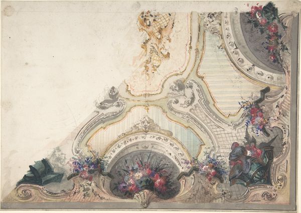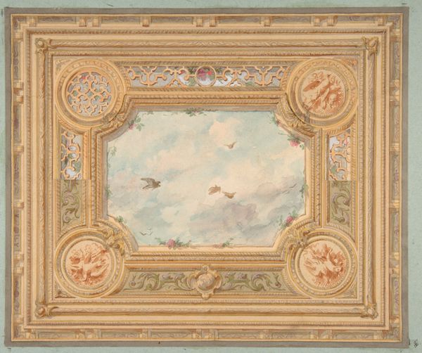 Curator: What a whimsical world! It's as if the room has suddenly dissolved, replaced by an endless sky filled with playful cherubs. Editor: Exactly! We're looking at "Design for a ceiling painted with a trompe l'oeil awning and putti in clouds." It is a watercolor drawing by Jules-Edmond-Charles Lachaise, likely created between 1850 and 1900, here in the Met’s collection. You immediately keyed into its charm and it really demonstrates a popular aesthetic of that time! Curator: Trompe l'oeil! Oh, how the French love to trick the eye. And those plump little putti... they bring such a sense of carefree joy. But what does this say about the people who wanted to be surrounded by this? Were they yearning for a sort of escapism? Editor: I think that's spot on. The 19th century saw the rise of a bourgeois class keen to display wealth and culture. Murals like these created an illusion of grandeur, offering a glimpse into a world beyond the confines of their everyday lives. Imagine yourself in a Parisian salon. Now picture lying back, gazing up... Curator: It’s practically theater. I mean the entire setup—an awning painted in such detail that one wants to reach out and feel the imaginary breeze and the illusionistic opening up to that sky with those little cupids… I suppose this celebrates artifice itself. Editor: Indeed. And notice the technical skill— the delicate gradations of watercolor that give depth to the clouds, and how Lachaise mimics fresco techniques despite using paper. This highlights both technical proficiency and the democratization of art. This sort of “everyday grandeur” moves out of religious contexts, too. Curator: I'm curious. Do you think Lachaise believed in these allegorical figures or was it just fulfilling commissions? Editor: I imagine it was a blend of both. The market demanded such images, yes, but within the framework, the artist still gets to exhibit a particular way of seeing the world. Curator: I love that you highlighted the democratization of the arts here; after all, that is, in part, why we all find ourselves in this particular institution, standing here today! It all blends together to create moments of, well, magic! Editor: That magic relies so heavily on these figures for patronage and consumption of the Arts throughout our institutional structures. The romanticization of everyday spaces in tension with material access provides such fruitful reflection.