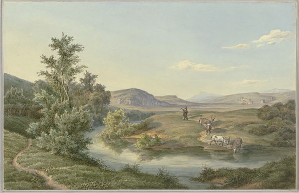 This tranquil landscape was rendered in watercolor by Georg Melchior Kraus, inviting us to contemplate the serenity of nature. The presence of cows grazing peacefully under the watchful eye of a shepherd represents the pastoral ideal. This motif has deep roots in art history, evoking a sense of harmony between humans and nature that transcends time and space. The motif of the shepherd and flock can be traced back to ancient Greek and Roman art, where it symbolized Arcadia and the Golden Age. This symbol suggests a longing for a simpler, more idyllic existence. The bridge, a structure designed to overcome obstacles, speaks to our universal desire to connect and overcome barriers. It also mirrors the non-linear, cyclical nature of symbols, which resurface, evolve, and take on new meanings in different historical contexts.