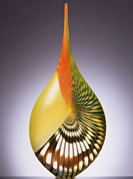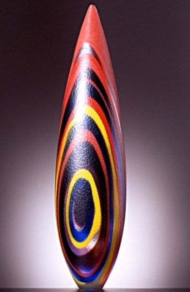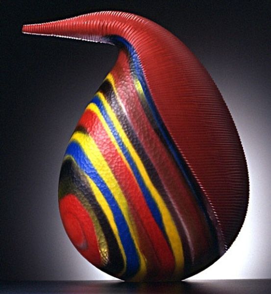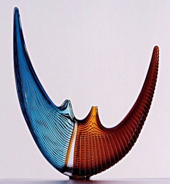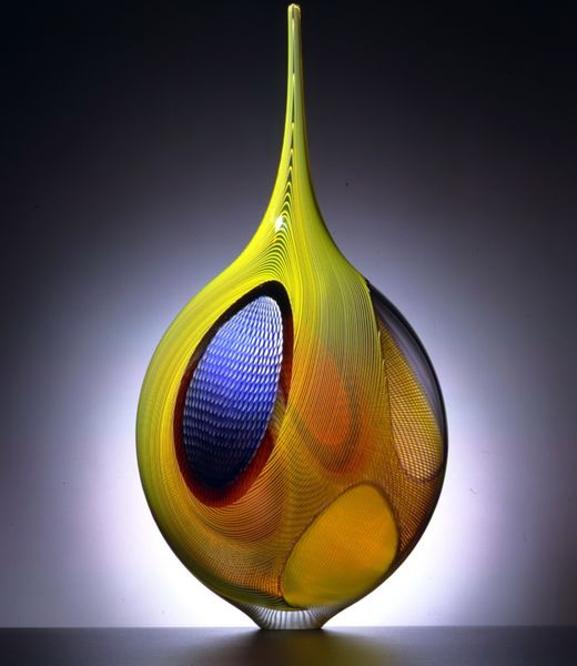 Curator: This striking piece is "Dinosaur," a glass sculpture crafted in 2011 by Lino Tagliapietra. Editor: Dinosaur? It seems almost… optimistic. The looping curves at the top give it such lightness, almost like a stylized flame. I'm immediately struck by the contrast between the solid base and that playful, tendril-like extension. Curator: The artist's command of form is indeed remarkable. Observe how the concentric bands of color—primarily yellow, red, and blue—are compressed and stretched, defining the curvature of the piece and leading the eye upward. Editor: The layering of those colors, the way they converge and diverge, recalls, for me, the cyclical nature of geological strata. It evokes primordial life emerging, then arching skyward in its most celebratory state before looping in on itself. Curator: A fascinating reading. I'm drawn to the interplay of geometric structure and organic fluidity. The precision of the lines against the sculpture's overall biomorphic form creates visual tension. It verges on complete abstraction. Editor: But even abstraction retains cultural resonance. The "dinosaur" label may seem ironic given the artwork’s sleekness. Is Tagliapietra perhaps suggesting the enduring nature of organic forms, reborn in unexpected ways? Glass might be the ideal medium to highlight the cycle of decay and revival that dinosaurs embody. Curator: Perhaps. One could analyze the visual elements of modernism evident here; its formal purity, simplified form, and emphasis on material qualities are palpable. Editor: Whether a testament to modernist form or the cycle of rebirth, the visual symbolism within is undeniably potent. It provokes contemplation about permanence. Curator: Agreed. There's a controlled energy in the execution. It really speaks to the artist's deep understanding of process and material. Editor: The way such bright colors are contained and balanced gives off warmth. The longer I spend with it, the more uplifting its presence becomes.