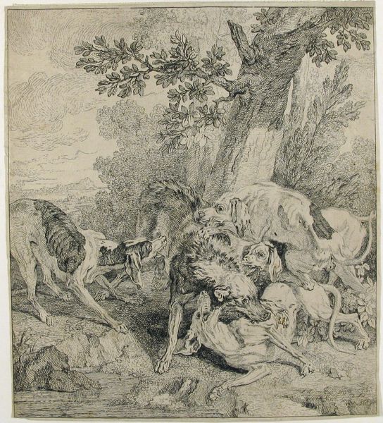 Curator: Before us, we have Nicolaes Berchem's "Cow Relieving Itself," dating somewhere between 1635 and 1683. It's an etching, printed on paper, currently held at The Art Institute of Chicago. Editor: My goodness, that cow is really going for it! Such directness, a brutal honesty of nature. Curator: The medium is intriguing. The etching process suggests mass production, the democritization of art...yet, Berchem was no ordinary printmaker; he came from a family of artists and art dealers, which undoubtedly shaped his perspective. Editor: I suppose, seeing that it depicts a rather crude act, it speaks to the cycle of life; quite funny when you see what is just another day at the office to these farm creatures, rendered with such care using etching and then disseminated. Curator: Etchings allowed artists to circulate imagery widely, connecting them to emerging markets and bourgeois consumers. Berchem likely made multiple impressions, catering to an increasing appetite for genre scenes of peasant life. Look closer to the figure resting, is this leisure for this subject as he works as a cow herder? Editor: You're right, there is someone sleeping peacefully beside those resting animals. It's wonderfully serene. Perhaps, in a subtle jab at idealized pastoral scenes that were trending in art. The Baroque sensibilities shine. Curator: Exactly, the genre painting blends with these pastoral elements quite successfully and one could say that in it, there is tension, an acknowledgement of daily tasks being far removed from ideal. Berchem's skill shines through—note the varied line weights that create depth, the textures… he expertly crafts form from humble material: ink on paper. It challenges hierarchical boundaries that dictate 'high art' subjects versus 'low art' activities. Editor: The lines buzz with vitality, all those goats in the left-side horizon... they are so dynamic! And yes, absolutely to the materiality…that tactile quality almost gives a physical feeling to that smell emanating from the focalized cow rear. Ha! This challenges all notions of a precious aesthetic experience, doesn't it? Curator: Perhaps this artwork challenges these conventional codes through the juxtaposition of mundane subject matter with expert rendering of these landscape themes through mass media means of consumption. Editor: Thinking about it, I am certain the message I take away is that our lives should have room for both refinement and... well, cow wee-wee.