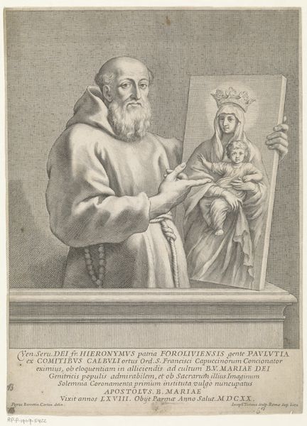 Editor: This engraving, “Heilige Patricius” by Mattheus Borrekens, created in 1644, depicts Saint Patrick. I'm struck by the almost unsettling juxtaposition of the holy figure with the grotesque dragon at his feet. What can you tell me about its symbolism and context? Curator: This piece speaks volumes about the construction of power and the suppression of indigenous beliefs during the spread of Christianity. Saint Patrick is presented as triumphant, standing over the defeated dragon – a clear allegory for the vanquishing of paganism in Ireland. Notice the cherub actively piercing the snake; it’s not merely decorative, but a symbol of actively suppressing existing beliefs. How might this image have served the political and religious agenda of the time? Editor: I suppose it was intended to reinforce the Church’s dominance and legitimize its power by visually representing the triumph over pre-Christian traditions. Is the specific style of the engraving itself a reflection of the socio-political environment? Curator: Absolutely. The Baroque style, with its dramatic contrasts and emotional intensity, served to amplify the message. Consider the way the light falls, highlighting Saint Patrick and obscuring the dragon. This theatricality was used to persuade and inspire devotion, but also to assert control. What does it suggest to you about the visual language used to justify colonialism and cultural erasure? Editor: It highlights how art can be used not just to depict, but to actively shape perceptions and beliefs, and enforce societal norms by demonizing existing cultural practices. Thank you, it definitely made me think more critically about the visual narratives in the piece. Curator: And to think about whose stories get told, and whose are erased, is a crucial step in understanding not just art, but also history and its impact on our present.