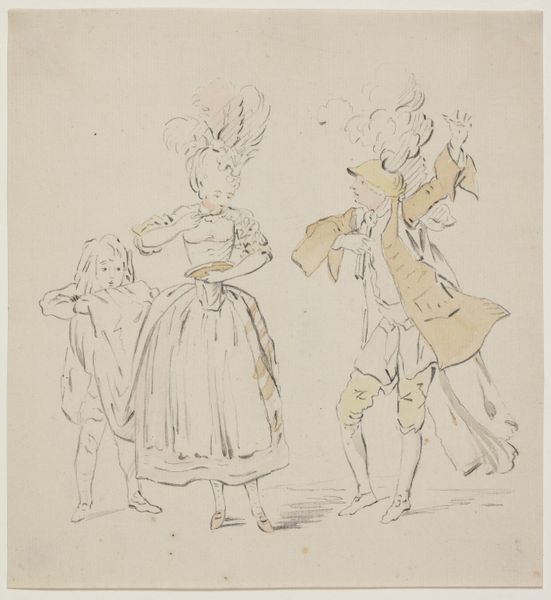 William Austin created this print, "Long Thomas and Mad-le G-d Going to the Pantheon in Their Natural Masks," using etching and engraving, processes that allow for the creation of multiple impressions, making art accessible to a wider audience. The linear quality of the printmaking medium emphasizes the exaggerated features of the figures, caricaturing their forms. Through the skilled manipulation of line, Austin critiques the social elite, emphasizing their perceived vanity. The work involved in creating this print, from the initial design to the final impression, underscores the artist's labor and intention, offering insight into the social context of 18th-century England. The very nature of printmaking challenges traditional distinctions between fine art and craft, as it combines technical skill with artistic expression to produce works that can be both aesthetically pleasing and socially relevant.