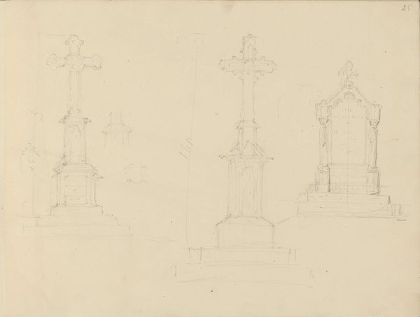 Editor: So, here we have Pierre Cuypers' "Studieblad met altaren en bladornamenten," from around 1850, a pencil drawing at the Rijksmuseum. The sheet of studies feels light and airy, but the architectural forms, well, they feel heavy and ornate at the same time. What catches your eye here? Curator: Oh, this page sings to me of creative play! Look how Cuypers, around the mid-19th century, isn’t just copying; he’s dialoguing with the past, the medieval past especially, swirling its essence into something fresh. Can you see how he’s using the altar studies to experiment with line and form? He's seeing what can come of just the basic idea of altar, how many variations can it hold? Editor: Yes, definitely. It's like he's brainstorming visually. What do you make of the page being toned? Does the aged paper affect how we see his design process? Curator: Mmm, think of the toned paper as adding a whisper of history. It almost dissolves the crispness, nudging us to imagine these designs in a grand, aged cathedral, wouldn’t you say? Does it perhaps soften what could be construed as clinical and formal, to reveal the artist's inspired and enthusiastic hand at work? What would you use these designs for? Editor: If I'm Cuypers, I use them as an archive of inspiration to reimagine historical concepts into modern building projects! Thanks, that perspective made it a whole lot clearer! Curator: Exactly. That, in turn, helps us appreciate his genius and the evolution of art. Perhaps even see beyond it too.