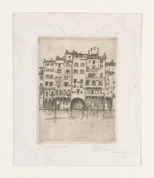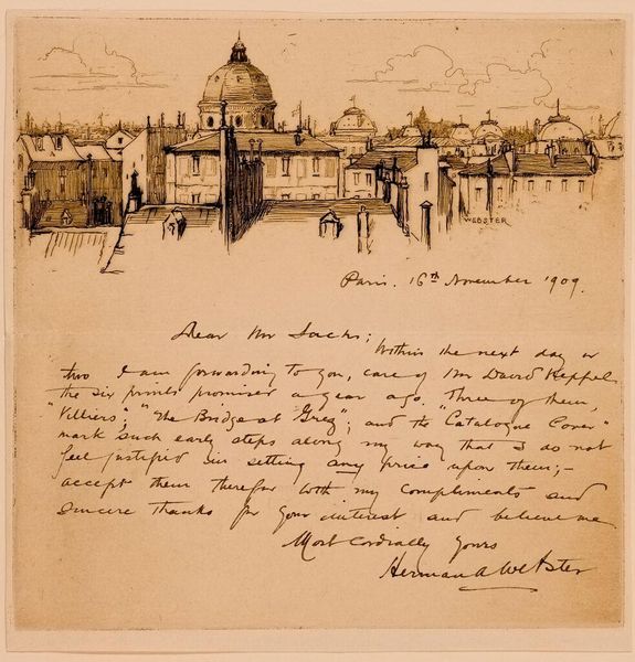 Editor: So, here we have an etching, called Invitation Head, by Herman Armour Webster. It shows a European cityscape, and the light makes it feel really warm, almost nostalgic. What do you see in this piece? Curator: The inscription suggests it was a gift, which gives it a personal touch. It reminds me of those old postcards, you know? Dreamy, a bit romantic. It makes you wonder what the artist wanted to convey with this particular view. A memory? An invitation to dream? Editor: I didn't think about the postcard feeling, but that's a great way to put it! Curator: Art's like that, isn't it? It's a conversation starter, a feeling sparker.