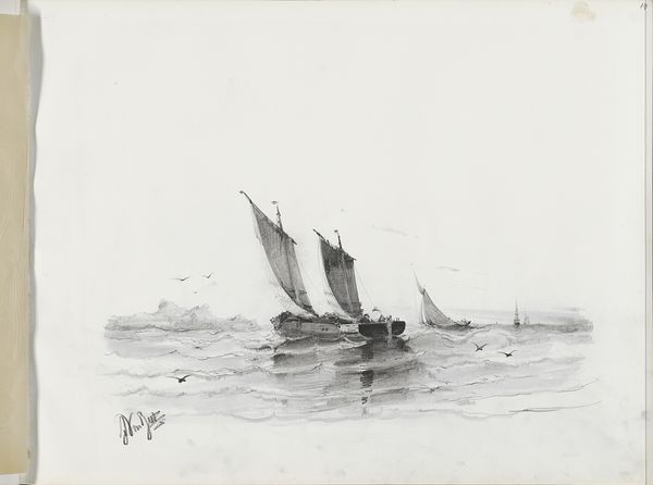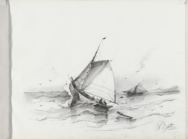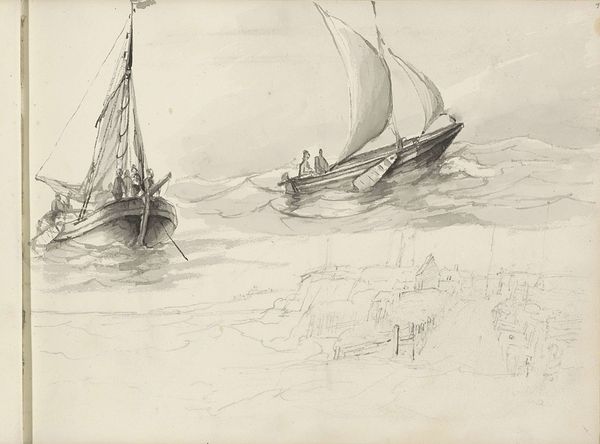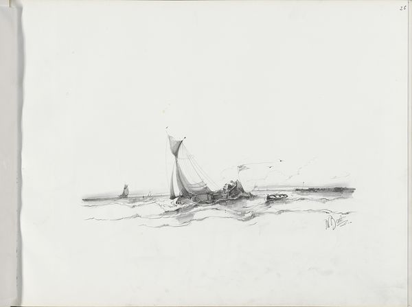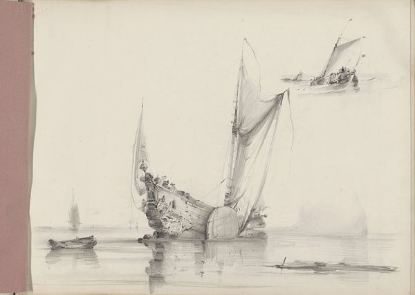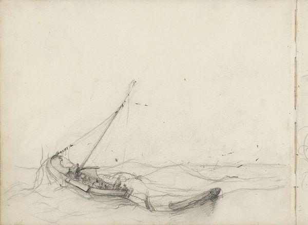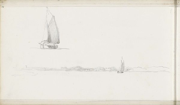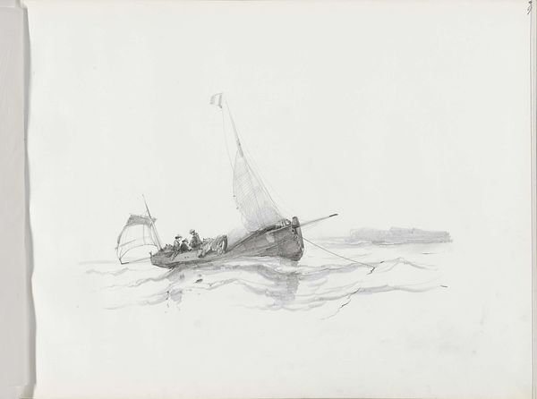 Curator: At first glance, this strikes me as a quiet scene. A lone sailboat, almost lost amidst the reedy shore and the vast expanse of water and sky. There’s a sense of isolation, perhaps even melancholy. Editor: You've hit on that feeling quite accurately. What we are looking at is a drawing by Albertus van Beest titled “Two Men in a Sailboat Near a Reed Collar," likely created between 1830 and 1860. It's pencil on paper and can be found here at the Rijksmuseum. Curator: The technique is so delicate. The texture of the reeds is almost palpable, achieved through subtle variations in pressure. And the rendering of the water’s surface captures movement, reflection… almost an impressionistic feel. What can you tell me about this Albertus van Beest? Editor: The artist lived in a time of vast social and political transformation. Industrialization had led to new markets for mass produced art objects and it's crucial to remember the economic systems that allow people the freedom to engage in activities like sailing and landscape drawings like these. As a landscape artist, he navigated a social and historical moment that celebrated a sentimental nationalism. Curator: Interesting—the labor that enables leisure. I hadn't thought of it that way, although there is that connection with industrial production because pencil production itself was evolving in terms of its technology and accessibility during van Beest's career. And it makes me wonder what these two figures represent in terms of masculinity during that period? They almost blend in as a component of the landscape itself. Editor: Right, we should absolutely consider the societal norms governing the actions and freedoms of these men, particularly in contrast to women during this era and the intersection of the societal demands for production in the new capitalist markets. What narratives does the drawing conceal about class and gender? Are these men leisurely observing the environment or earning their livelihoods through this labor? Curator: And the question of art versus craft arises again, I suppose, in such a quietly skilled pencil drawing such as this one. The level of detailing across such a sparse selection of materials feels noteworthy and challenges the grand oil paintings and narrative pieces so prominently positioned within our history. It brings an intimacy that monumental painting would be hard pressed to recreate. Editor: These pencil markings on a paper page are powerful indicators that what constitutes artistic value continues to morph over time! Thank you for your insights, it helps enrich how we examine Albertus van Beest’s art! Curator: The pleasure was all mine! Looking at the physical manifestation of this artist's labors truly adds another facet to its reception.