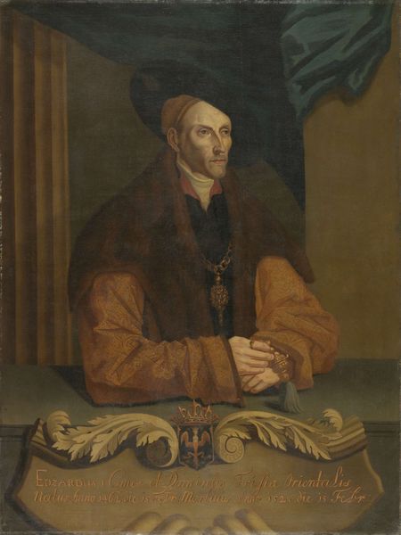 Editor: So, here we have Maarten van Heemskerck's "Portrait of Johannes Colmannus, Rector of the Convent of St. Agatha at Delft," painted sometime around 1538-1540. It's an oil painting, currently at the Rijksmuseum. The subdued tones create such a serious and almost somber mood. What catches your eye in this piece? Curator: Well, immediately I'm struck by the stillness, that quiet intensity radiating from Colmannus’s gaze. It's not just a portrait; it's like a window into the mind of a Renaissance scholar, isn’t it? You can almost smell the old parchment and ink. And then you notice the symbolic touches – that small tree in his hand! I wonder, could that symbolize spiritual growth, resilience? Editor: A tree? I hadn't considered that! It looks like he’s holding a book too? I'm drawn to his face, and I can see how precisely van Heemskerck has painted every line and wrinkle, and I was thinking the small tree was just decoration. Curator: It’s interesting that the details almost seem like part of a landscape within a portrait, wouldn’t you say? Look at the somber clothing, but how precisely you can tell it is good quality cloth, despite its hue. His humanity and his status, rendered at once. This isn’t a god, nor just some farmer. The coat of arms tells you something too, doesn’t it? It gives us the social context that this wasn’t just some man; the artist wanted us to know this. What do you make of that background texture and shading? Editor: The coat of arms almost blends into the dark background, yet it gives Colmannus this aura of prestige. Curator: Yes, indeed. A Renaissance man deliberately framed. Do you find the overall impression invites you in or keeps you at arm's length? Editor: Now that you mention it, the framing does seem to say “Admire, but don’t approach." Curator: Exactly! It's a very skillfully staged presentation of power and intellect. Editor: I see that now! It's much more complex than I first thought. Thank you for sharing your insights! Curator: My pleasure! Looking at art together always opens up new perspectives for both of us, I think.