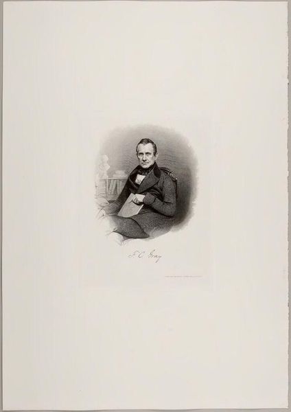 Editor: This is Lazarus Gottlieb Sichling's "Francis Calley Gray," housed at the Harvard Art Museums. It's a very formal portrait; what strikes you about its composition? Curator: Note the subtle use of chiaroscuro. The artist employs tonal contrasts to sculpt Gray's face, drawing our eye to his expression. Observe, too, the geometric precision in the arrangement of objects. What do you observe? Editor: Well, the subject is framed by a soft, almost dreamlike vignette, which contrasts with the sharp lines of his jacket and the paper he holds. Curator: Precisely. The interplay between the soft vignette and the sharp lines creates a visual tension, guiding our gaze and enhancing the work's visual dynamism. Editor: It's fascinating how the composition creates such a dignified, yet subtly dynamic, effect. Curator: Indeed, by analyzing the formal elements, we gain deeper insights.
