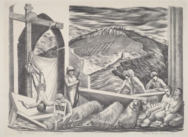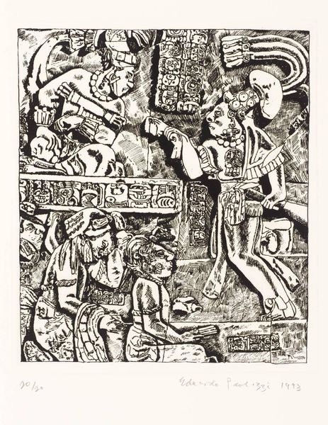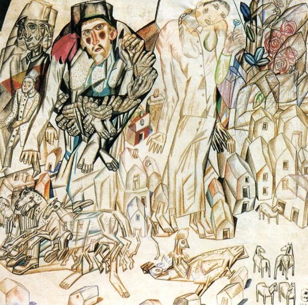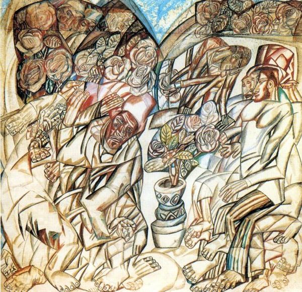 Editor: Pavel Filonov's "Execution (After 1905)," made in 1913, is a mixed-media drawing on paper that depicts, well, a whole lot! The entire image seems to seethe with brutality, yet I can't quite grasp the specifics of what's unfolding here. What is your sense of this dense composition? Curator: It’s quite a whirlwind, isn’t it? To me, Filonov’s work is like peering into the psyche of a revolutionary. It's brutal but brilliant! Think of it not just as an illustration of execution, but as an explosion of pent-up frustration. He crams so much symbolism in there – those angular figures almost vibrating with discontent, the religious imagery contorted into a landscape of pain. It feels almost… prophetic. Like a glimpse into the chaos that would soon envelop Russia. What do you make of the way he renders the human figures? Editor: They remind me a bit of cubist fragmentation. Everyone seems stiff and regimented, but teeming beneath the surface, which I feel is at odds with its brutal expressiveness. It's like an entire society caught in a fractured reality. Curator: Exactly! It's that tension, that simultaneous order and chaos, which really gets under my skin, but he gives you all the bits to create your own meaning. Filonov was wrestling with some big questions about humanity and progress – can you see that? Do you think he believed violence was the only answer? Editor: I’m not sure. Maybe it's less about advocating for violence and more about capturing its psychological impact. Filonov certainly gives you a lot to ponder... It definitely resonates differently now given Russia’s subsequent history. Curator: Indeed, this feels less like reportage and more like prophecy. I’ll tell you what, engaging with a piece like this makes you think doesn't it? Art that truly scratches beneath the surface! Editor: I agree. Filonov’s chaos definitely encourages the exploration of uncomfortable truths, about history, about revolution. I'll definitely look closer next time I see this drawing.