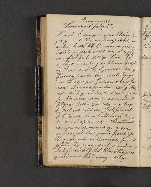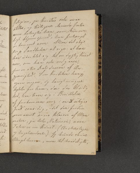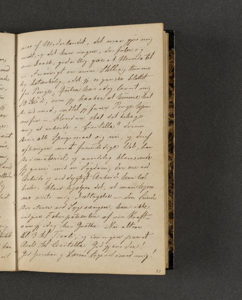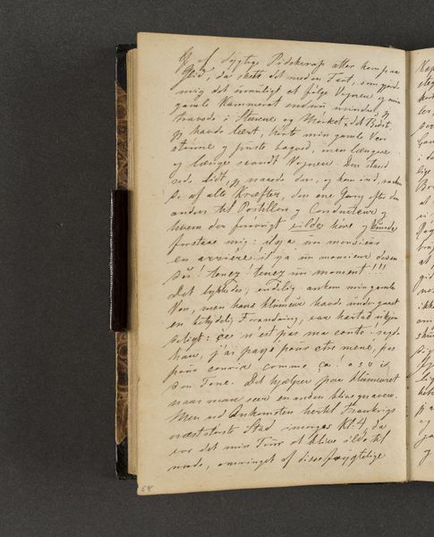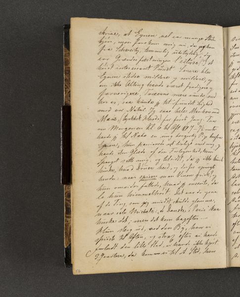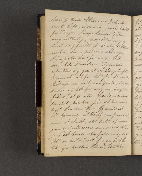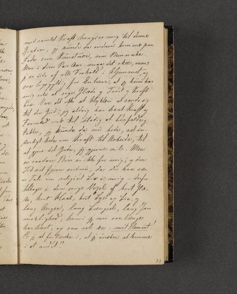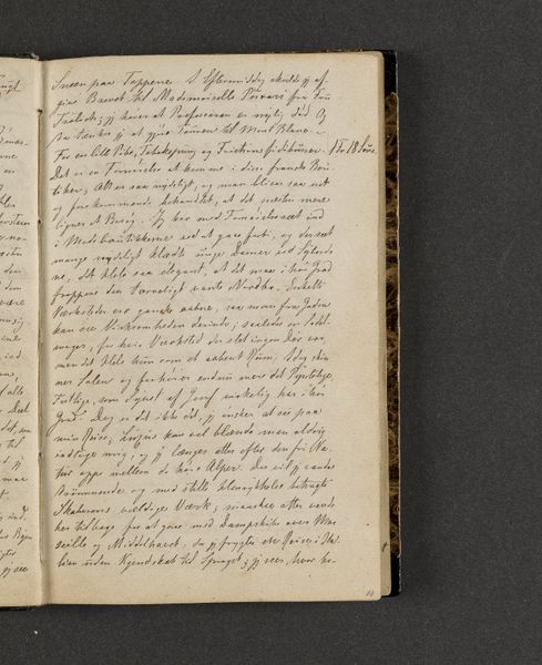 Johan Thomas Lundbye created this page from his travel diary with ink on paper. The composition is dominated by dense lines of text filling the page, with subtle variations in the pressure and thickness of the writing. The overall effect is one of intimacy, inviting the viewer to contemplate the artist's personal reflections. The linguistic structure here echoes the visual density, creating a semiotic system where words function not just as carriers of meaning, but as textural elements. Lundbye’s choice to crowd the page challenges conventional notions of space and legibility, disrupting any easy interpretation. The structural arrangement emphasizes the act of recording as a continuous, almost compulsive process. Consider how the lack of visual breaks destabilizes the reading experience, transforming the diary entry into a field of signs open to interpretation. The diary does not offer fixed meanings but rather invites the reader to engage in a dynamic process of discovery.