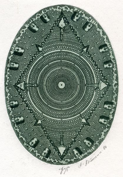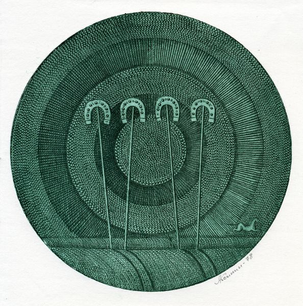 Curator: I’m struck by the immediate feeling of quiet dread this piece evokes. It's heavy, almost oppressive. Editor: That’s interesting. What we're looking at is Oleksandr Aksinin's "Gautama's Hand," a 1980 ink drawing on paper. Knowing something about Aksinin's experiences and artistic community helps to contextualize your feeling, I think. Curator: Oh? How so? I am especially intrigued by the intense intricacy of the pattern work in blue ink... almost obsessive in its repetition. Is there any evidence the labor was shared? Editor: Aksinin worked in Soviet Ukraine where artistic expression was carefully controlled and censored. His participation in underground art movements and knowledge of historical artistic oppression doubtlessly influenced his artistic approach. The hand is such a potent, recurrent image in both sacred and profane art traditions—to see it depicted this way… Curator: Indeed, the lines making up the fingers are simple, elegant even, until one considers the heads that crown them. And that sole eye that is staring—accusingly maybe. It all works together with this elaborate—but unsettling—background of tightly-packed motifs to contribute to this effect of stifled claustrophobia and an uneasy balance of form and message. Editor: Consider also the implied labor. It takes time to create this intricate pattern. Outsider art is associated with intense singular focus, and that labour is critical. It becomes a record of the time and resources available to the artist and also acts as a subtle resistance to the pervasive Soviet demand for labor directed at more "useful" things. Curator: Absolutely. Perhaps it is my training, but it's the formalism in the symbolism that grabs me and holds me here. This symbolic configuration...the contained hand with faces rather than fingernails all but shrieks. Editor: It all comes together to create an unforgettable, emotionally resonant work, deeply entwined with Aksinin's own social, political and personal context. I come away marveling at his method and drive. Curator: And I’m left contemplating how formal artistic choices amplify existential anxieties.
