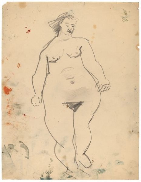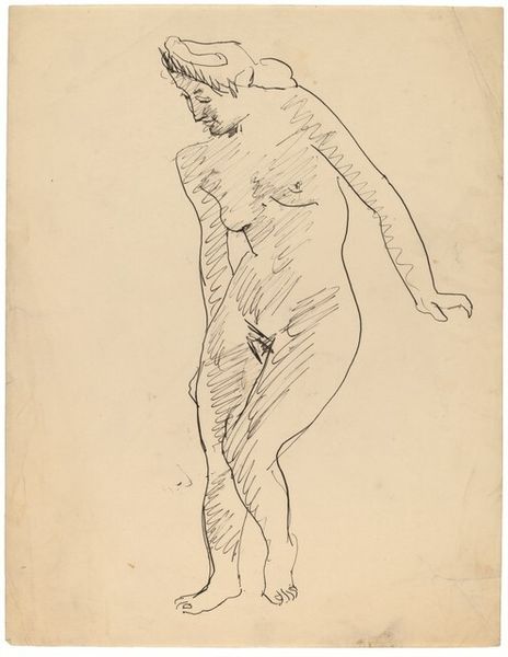 Curator: Here we have a drawing attributed to Mark Rothko. It's titled "Standing Female Nude Facing Right [verso]," rendered in ink. What's your initial read? Editor: It feels...unsettled. The lines are so stark and raw, and the pose is almost defiant. Not at all the hazy, ethereal Rothko I expect. More punk rock sketch than contemplative color field! Curator: Indeed! This predates his signature abstract style. The nude form, even in its simplified state, echoes ancient ideals, a timeless motif revisited through the lens of modernist line work. It has that feel, of revisiting an idea. Editor: Right. Nudes are often about vulnerability and display, but this one…the shadows, the sketchy hand…she possesses a surprising strength. What do you make of the negative space, that bare paper surrounding the figure? It feels like so much absence around the being of her. Curator: It heightens the intimacy, don't you think? The blankness isolates her, focuses our gaze intensely on her stance, on the very line itself. This is the Rothko grappling with representation, teasing out emotional content through the oldest of subjects, maybe. The line is its own emotion! Editor: The hand clenched like that, pulling on a string almost... is she anchored? Or trying to anchor *herself*? The paper looks almost stained with time. It whispers secrets that even she, as a sketched icon, can't fully contain. I find I keep returning to that line in her upper torso as well: so much conveyed, with so very little! Curator: Absolutely. And I feel like her expression holds ambivalence, maybe a sense of wary anticipation. I'd be fascinated to compare this with his later color field pieces, see if the anxieties of form resurface within the haze of hue. Editor: Yes! Seeing those blocks of color now as abstracted figures rather than simple meditations…I appreciate how an early work, even in its relative rawness, contains all the seeds of the future. It speaks to me about continuity, about an evolution of mind, but a soul persisting under everything. Thank you. Curator: A pleasure. A fine way to bring a richer dimension to what's so readily thought of as “classic” Rothko.