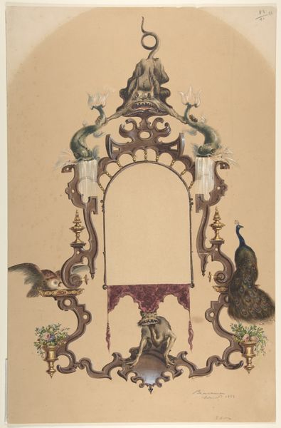 Editor: This is a drawing entitled "Carved Walnut Hall Rack," created around 1936 by Thomas Byrne. The rendering in ink feels both intricate and a little… melancholy to me. What’s your take on this piece? Curator: The stark contrast in Byrne’s drawing makes me consider how even mundane domestic objects carry embedded social narratives. A hall rack, traditionally placed near an entryway, served as a transitional object between the private sphere and the public world. Editor: That’s an interesting way to put it. A liminal space. Curator: Exactly! Now, think about 1936. What anxieties might people have carried with them as they entered or left their homes? What roles—gendered or otherwise—did that hall rack subtly enforce, by holding hats, coats, umbrellas? Does this connect to domestic labor or gender roles for you? Editor: I hadn't considered that at all. The rack is so ornate; I was just thinking about craft, but seeing it as a symbol of societal pressures... Curator: And look at how Byrne renders the mirror--as a series of vertical bars that obscure, not reflect. Is Byrne making a comment on how society obscures identity, creating a fractured reflection of the self? What are the implications of having such a divided identity? How can society reform to accept a holistic sense of self for those who are made to feel ‘other’? Editor: Wow, I see it completely differently now! Thank you for broadening my perspective. Curator: It’s all there in the piece, just waiting to be excavated! I think reflecting on pieces such as this helps contextualize not only society in the 30s, but current day constraints and social struggles that continue to permeate the American Dream.