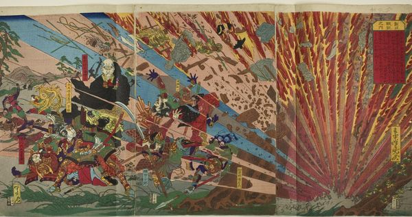 Curator: This is Hokusai's "Travelers Crossing the ÅŒi River/Shimada," part of his series illustrating the Tōkaidō highway. It captures a vivid scene of arduous river crossing, quite literally bearing the weight of commerce and travel. Editor: Wow, what a sight! It strikes me as both comical and deeply unsettling. It's like a fever dream of bodies and burdens, all washed in this pale light. Curator: Indeed, there's a powerful undercurrent of class disparity here. We see the privileged riding high while others physically strain, mirroring broader social hierarchies. The landscape almost becomes a character itself. Editor: Absolutely, the river is like this relentless force, and the people become mere cogs in its flow, yet there's such an incredible vibrant energy and resilience captured in those vibrant colors that it feels so captivating! Curator: The absence of specific dating invites interpretation through various lenses. It allows us to consider enduring themes of labor, inequality, and human resilience across time. Editor: It really is amazing how Hokusai manages to make the mundane feel so otherworldly and profound. Thanks, that was truly enlightening. Curator: My pleasure; I'm glad we could explore its depths together.
