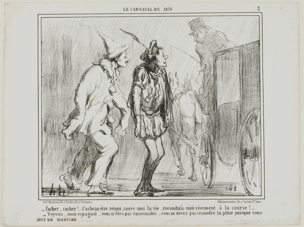 Honoré Daumier created this lithograph, "Un animal rempli de modestie…", sometime in the mid-19th century. The drawing presents a darkly humorous scene dominated by the rough textures of its medium and the stark contrast of light and shadow. Daumier uses a semiotic language of caricatured forms to critique societal norms. Note how the butcher, rendered with exaggerated features, pulls a reluctant horse towards an unseen fate. The horse's resistance is palpable through its strained posture and averted gaze. The backdrop is an arrangement of hanging cooking pots. They serve as a mordant reminder of the horse's grim destiny. Daumier uses a visual language of satire, playing with societal roles. He suggests that the structures that govern our relationships with animals are based on exploitation. The print challenges us to consider the power dynamics between humans and animals. It also questions the ethics of consumption.