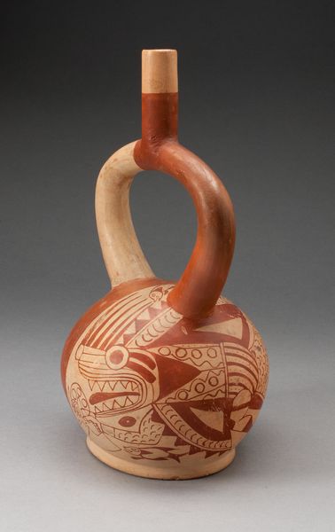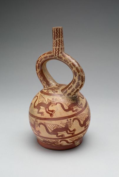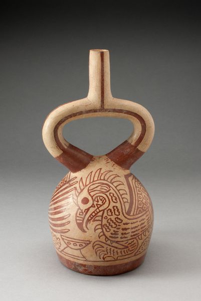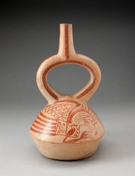 This ceramic stirrup spout vessel with fineline bird motifs was made by the Moche people. It is made from clay and pigments and through processes of coiling or modeling, and firing. The most striking aspect of this vessel is its form, where function meets artistry, a common characteristic in Moche pottery. It’s made with a stirrup-shaped handle, connecting the spout to the vessel's body, an innovation that ensured even pouring and reduced spillage. The surface of the vessel is covered in intricate fineline drawings depicting bird motifs, which are carefully applied with a steady hand. This complex technique underscores the potter’s skill. Vessels like these were not only utilitarian but also deeply symbolic. Their creation involved labor-intensive processes, indicating specialized roles within Moche society, while also conveying a symbolic significance of cultural rituals and beliefs. These beliefs were deeply rooted in the community. Considering the material, making, and cultural context deepens our understanding and underscores that there is no distinction between fine art and craft.