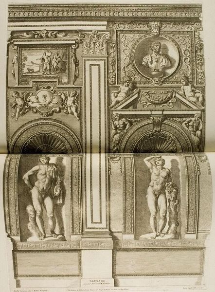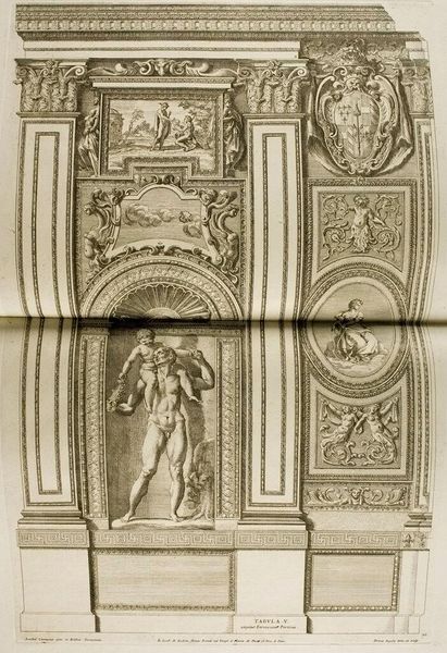 Curator: This engraving by Pietro Aquila, dating from around 1670, depicts wall decorations from the Galeriae Farnesianae. The sheer density of ornamentation is striking. Editor: Yes, visually it's quite baroque, isn't it? The rhythmic interplay between the figurative elements and architectural details creates a dynamic surface. Curator: The Farnese Gallery was a hugely important site of artistic patronage and cultural power in its day, influencing decorative schemes across Europe. Reproductions like these helped disseminate those ideals. Editor: I'm drawn to the contrasts in texture—the smooth curves of the sculptures set against the geometric precision of the architectural framework. It's a careful balance of naturalism and artifice. Curator: Absolutely. And these idealized human forms, presented as decoration, speak to the values embraced by the elite: classical learning, beauty, and, of course, the body. Editor: It’s intriguing how the artist uses light and shadow to give depth to the engraving. The modeling of the figures is very refined. Curator: A fascinating glimpse into the circulation of taste and power in the 17th century. Editor: Indeed, a potent combination of visual richness and intellectual rigor.