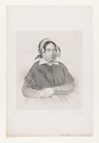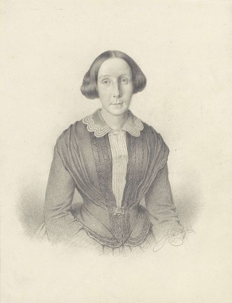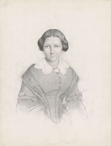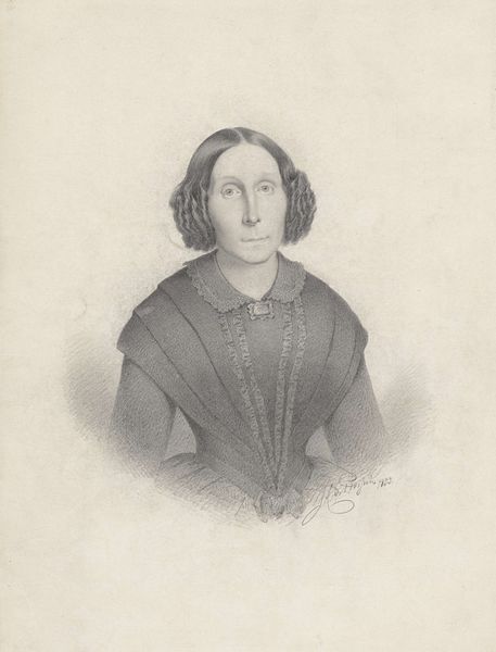 Curator: Looking at this "Portret van een onbekende vrouw" by Anna Catharina van Boekeren, dating roughly between 1828 and 1846, what are your initial thoughts? Editor: There’s a striking formality to it. The balance is meticulously managed, especially the soft gradations achieved with what looks like primarily pencil work. Curator: Exactly. Consider the meticulous craft involved here. In that era, the ability to render such detail using only a pencil was a marker of both skill and access to materials. We also should reflect on the economics surrounding artistic creation in the 19th century and who had the leisure time to either be a subject or an artist. Editor: It's certainly illustrative of Romantic-era portraiture but rendered through a unique interpretation of academic art with a somewhat austere presentation. Note how the soft lighting contributes to the somber mood. The focus is primarily on tonal variation. Curator: How do you interpret this woman’s place within that historical moment through this portrayal? What sort of constraints are implicit when it comes to her representation in that cultural environment? The artist also was an unindentified female - an amateur possibly or simply unknown. Does it carry symbolic meaning? Editor: Symbolism can be derived, yes, yet the way her garments are subtly defined offers a kind of elegant reserve, it is almost like she doesn't call for attention but instead reflects the delicate application of tone that guides the gaze. Her gaze and form dictate my perception. Curator: I agree there’s an intentional understatement, but perhaps also imposed restraint. The softness could represent her social position rather than simply being an aesthetic choice, given it being pencil, what it takes to procure high quality materials. These factors give texture and meaning to our engagement with the portrait and give it context within the history of portraiture in general. Editor: In the end, by studying its construction and pictorial features, this drawing presents a compelling look into the composition that makes us ponder representation and societal constraints of that time. Curator: The piece lets us understand both her and possibly the author, because in their lines, forms, the social fabric becomes apparent.