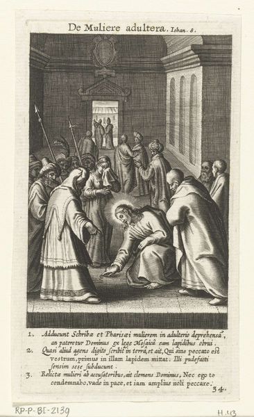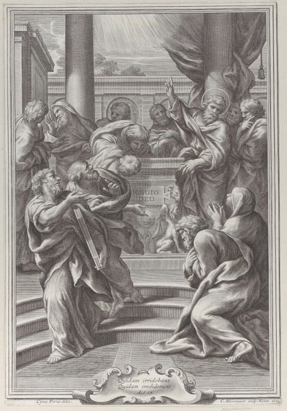 Curator: This engraving, titled "Meisje voor priester geleid" or "Girl Led Before a Priest", created around 1740 by Giovanni Cattini, depicts a scene brimming with tension and ceremony. Editor: My immediate impression is its stark formality. The stark contrast achieved solely through line work—it projects a solemn, almost oppressive atmosphere, don't you think? Curator: Indeed. Note how the artist uses a complex network of hatching and cross-hatching. Observe the materiality, it must have taken hours. Each line meticulously carved. This level of detail elevates the narrative to something akin to history painting despite its form. The labor invested reveals devotion to its subject. Editor: And what of the symbolism, the composition? The priest, elevated both physically and metaphorically, dominates the scene. The female figure at the bottom, seemingly in a state of undress, contrasts sharply with the robed figures above. Is Cattini commenting on societal hierarchy, perhaps? Curator: Perhaps. But also, observe the dynamic play of gazes: everyone’s looking towards a single ritual moment with concentrated focus on some ritual object hanging from that young man’s hand above the seated female. Consider the formal rhythm, where poses contrast with patterns formed by draped textiles to heighten the psychological impact. Editor: Yet consider the material reality. This wasn't created in isolation. The metal plate itself had to be crafted, treated, engraved using specialist tools... each stage informed by historical practices embedded within workshop traditions and religious structures of that period. Was it created on commission, and what controlled its distribution to what audiences? Curator: All are insightful points. Cattini's utilization of visual cues, his handling of composition and expression create a microcosm ripe with thematic contrasts of youth, power, faith. The engraving, in its formal arrangement, provides commentary beyond the presented subject matter. Editor: And examining these production aspects highlights that such engravings acted both as artistic products and propagative tools representing hierarchies while reinforcing social doctrines. We need both perspectives for fuller insights. Curator: I appreciate the layered view offered, highlighting how socio-political circumstances influence both making and receiving meanings inside visual forms. It enriches our experience, moving away from seeing these as pure depictions towards more significant sites in broader historical dynamics.