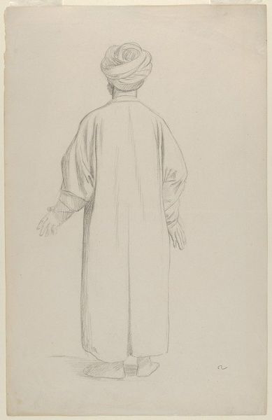 Curator: This drawing, part of the Tate Collections, is by Prince Hoare, born in 1755. It depicts a woman in what appears to be traditional dress. Editor: It's quite delicate. The lines are tentative, almost ephemeral. The red accents on the fan and garment offer a stark contrast to the gray of the rest of the sketch. Curator: Hoare was a prominent figure in London's artistic circles, particularly in the theater world. I wonder if this was a preparatory sketch for a costume design. The woman's pose seems almost performative. Editor: Possibly. But the simplicity of the drawing also highlights the labor involved in creating such intricate garments. Think of the textile production and the skills necessary to produce her clothing and fan. Curator: Absolutely, and consider the social context. Such stylized depictions often served to exoticize other cultures for a Western audience, reinforcing existing power dynamics through visual representation. Editor: Still, there's an undeniable beauty in the craft itself, regardless of its cultural origins. Curator: True. I suppose it invites us to consider the multiple layers of meaning embedded within a seemingly simple sketch. Editor: A testament to how labor and materials are as much historical artifacts as they are artistic expressions.