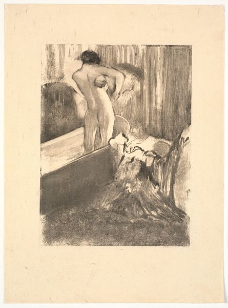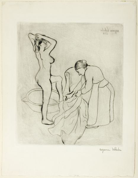 Curator: This etching, made with ink on paper, is Suzanne Valadon's "Two Women Drying Themselves," created around 1895. The work features two nude women, one bent over, perhaps drying her hair, the other standing and reaching above her head, also seemingly with a towel. Editor: It strikes me as deeply intimate and personal. The scratchy, unfinished quality of the lines almost feels voyeuristic, as though we've caught a glimpse of a private moment. Curator: And isn't that suggestive of the cultural context? Here we have Valadon, herself a model for artists like Renoir and Toulouse-Lautrec, now taking control of the gaze. She portrays these women not as objects of male desire, but as subjects of their own actions. The imperfection you mention feels almost deliberate, resisting idealization. Editor: It is a fascinating take considering the themes of the period. Note the strong diagonal of the standing figure echoes classical forms, perhaps an appropriation, while the posture of the woman bent over references figures of labor. This pose is evocative. The head lowered and turned away represents a surrender, introspection and shame or privacy. Curator: Precisely. Considering Valadon's own marginalized position as a female artist in a male-dominated world, it becomes hard not to interpret this as a statement on the ways women are forced to present themselves. Or are prevented from simply *being*. These women seem caught between the gaze and their own autonomy. Editor: I like the texture. There are parts, especially the head and shoulders of the bent-over figure, that remind me of the thick dark of charcoal, creating dense shadowed regions. Curator: Yes, there's a raw immediacy that speaks volumes. One sees what feels like a push towards realism. The poses, slightly awkward, aren’t conventionally beautiful but truthful. The lack of idealization emphasizes the everyday reality of women's bodies. The unglamorous moment suggests the artist's social critique of conventional portrayal of women in the canon. Editor: Valadon is definitely playing with those artistic tropes and bending them towards what we may call the reality of the female gaze and female body. What do you feel the implications of that reality are? Curator: What Valadon achieved was pushing beyond a traditionally imposed voyeurism to portray these bodies as quotidian. It’s the quiet defiance I admire. Editor: Yes, it does feel powerful how the use of symbols is minimized to maximize reality. It's a glimpse into ordinary experience that lingers with the viewer. Curator: It definitely provides insight into the experience of simply existing as a female, both historically and today. Editor: I completely agree.