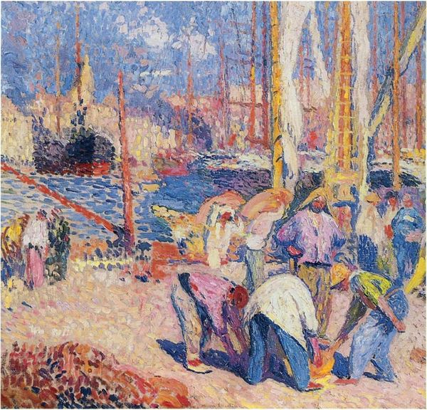 Editor: This oil painting, titled *Huile Sur Carton - Collection Particulière*, is by Maximilien Luce. It doesn’t appear to be dated. I'm really drawn to the hustle and bustle of the scene— it’s almost as if I can hear the murmur of the crowd and feel the energy of the city. What jumps out at you when you look at this piece? Curator: It’s a real glimpse into the late 19th century, isn’t it? Luce was a master of capturing fleeting moments of modern life. It makes me wonder, doesn't it, about the quiet stories these individuals carried within them? It's tempting to imagine myself standing there, smelling the river, feeling the breeze. Do you get the sense that you could almost wander right into it? Editor: Absolutely! The brushstrokes are so lively, especially in the water. The artist does not focus on detailed rendering, but gives you the essence of a moment, it is not unlike a stage. It has a particular look of authenticity. I can even guess what sort of activity these figures would be doing. Curator: It's not simply what's shown, but how the colour reveals light, how each person occupies their place in time, on that walkway. And it makes one ponder: in our relentless chase for detail, aren't we missing out on something profound? Think about that question: Are we losing the essential truth of things? Editor: That's a beautiful way to put it. I was so focused on the scene itself; now, I'm also contemplating about representation and perception itself! Thanks, I am truly thankful! Curator: Art, at its best, acts like a fun-house mirror – revealing hidden truths in its glorious distortions, prompting us to perceive and understand ourselves and our surroundings in a wholly fresh light! That makes every painting a potential adventure.