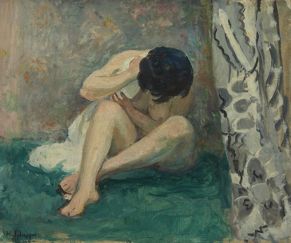 Jozef Hanula created this "Study of Female Nude" using oil paints and brushes. Consider the physicality of oil paint itself. It's a slow-drying medium, allowing for layers and corrections. You can see the artist has built up the surface, especially in the creamy tones of the model's skin and the drapery. This wasn't a quick sketch, but a deliberate act of layering and blending. The brushstrokes are visible, particularly in the background. Hanula wasn’t trying to hide his hand, but rather to emphasize the act of painting. Hanula likely would have been working from a live model, a common practice in academic art of the time. But he wasn't just replicating what he saw; he was interpreting it through the very material of his art, oil paint. Ultimately, this "Study of Female Nude" reminds us that even in the most traditional subjects, the artist's hand and the inherent qualities of the materials play a crucial role in shaping our experience.