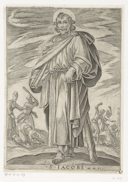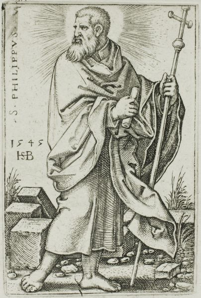 Editor: So, here we have "Saint Paul," a drawing, print, and coloured-pencil work dating from the early 16th century, attributed to Master WZ. It has such a solemn feeling about it. Tell me, what leaps out at you when you look at it? Curator: Well, the halo resembling exploding tinsel, for starters. I find it quite striking—almost comically so, yet also radiating a peculiar power. The gaze of Saint Paul feels incredibly intense, as though he’s peering directly into my soul—or perhaps judging my outfit choice. What do you make of his bare feet? Editor: I hadn’t noticed them at first. I wonder if that has some symbolic meaning or was it a simple aesthetic decision? Curator: It could be both! The Renaissance had a penchant for imbuing everything with meaning, yet practicalities also played their part. Is he grounded, humble, or simply airing his toes after a long journey? The sword is impossible to ignore as well. Considering Saint Paul never wielded one, you know... literally, what might the choice symbolize to you? Editor: Hmm, I guess it signifies his conversion, turning away from his old ways to a "sword" of faith. Curator: Precisely! Artists loved layering symbols, letting us, centuries later, decode their clever visual puzzles. Think of it like a beautifully cryptic Renaissance tweet. What's your final take after our chat? Editor: It's shifted from just being a portrait to this wonderfully layered and witty commentary on faith and transformation. Makes me want to go find other Renaissance "tweets" now!