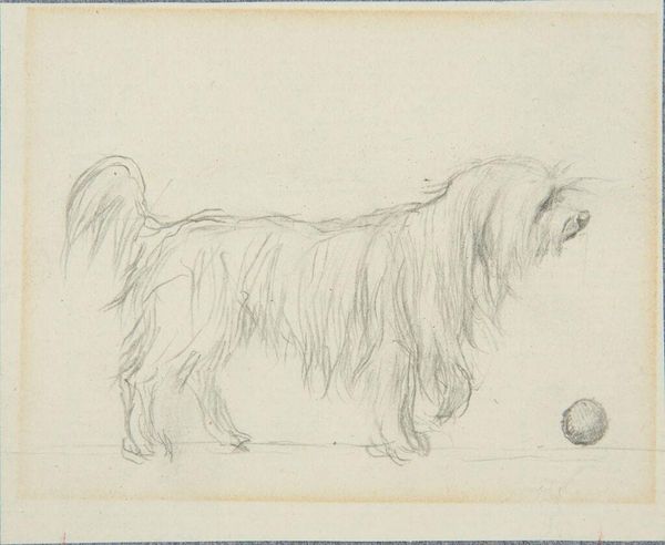 Editor: Here we have Edward Martin Taber's "Seated Dog with Ball," a charming little drawing at the Harvard Art Museums. It feels so intimate, like a stolen moment. What's your take? Curator: Ah, yes, a fleeting glimpse of canine contemplation. It's the immediacy of the sketch that sings to me. Do you see how the hatching behind the dog creates a halo effect, almost spiritual? Editor: Spiritual? I mostly see a furry friend waiting for a game. Curator: Perhaps, but isn't waiting a form of meditation? The ball becomes its mantra. It makes me wonder, what are we waiting for, really? Editor: I guess I hadn't thought of it that way. I just wanted to boop his nose. Curator: Art's funny like that, isn't it? It makes you want to boop noses and contemplate the universe, all at once.