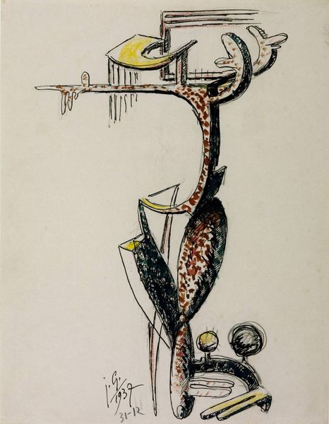 Editor: This is Julio Gonzalez’s "Figure with Balls, known as ‘Severe’", a pen and ink drawing. The title definitely fits; it feels very austere. What stands out to you about Gonzalez's process here? Curator: The roughness of the materials speaks volumes. Gonzalez, known for his metalwork, reveals a different kind of labor in this drawing. Notice how the pen strokes aren't delicate; they're forceful, almost like he's forging the image onto the page. Editor: So, you're saying the drawing mirrors his sculptural process? Curator: Exactly. Consider the availability of materials during the late 1930s. Metal might have been scarce, pushing him to explore form through more accessible means. This drawing isn't just a sketch; it's a record of material limitations and creative solutions. Editor: That makes me see the work differently now. The 'severe' quality isn't just aesthetic; it's tied to the constraints of its creation. Curator: Precisely. We can appreciate its artistic merit and how social and material conditions shape the work.