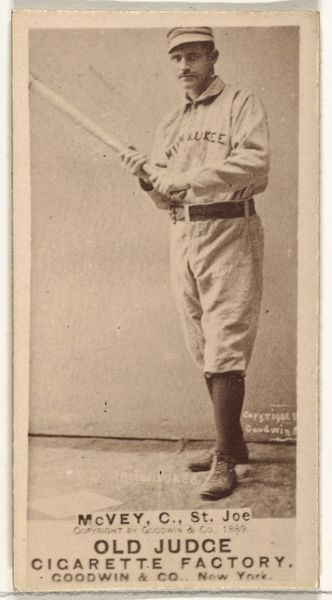 This monochromatic card, part of the Old Judge Cigarettes series, presents Herman C. Long, catcher for the Kansas City Cowboys. The composition centres Long's figure against a blurred backdrop, creating a subtle depth. The sepia tones enhance the sense of nostalgia, with the subject evenly lit, revealing the textures of the uniform and the baseball bat. The geometric form of the baseball bat contrasts with the organic curves of his stance, creating a visual rhythm. Printed ephemera like this can be seen through the lens of semiotics, where even minor details—the player's equipment, the cigarette brand's lettering—function as signs. These signs construct an image of turn-of-the-century Americana, linking sport, commerce, and cultural identity. The slightly faded quality adds another layer, subtly destabilizing the present moment with traces of the past. Note how the brand name "Old Judge" is prominently displayed, connecting the player's image to the broader consumer culture and suggesting how meaning is constructed through these visual and commercial interplays.