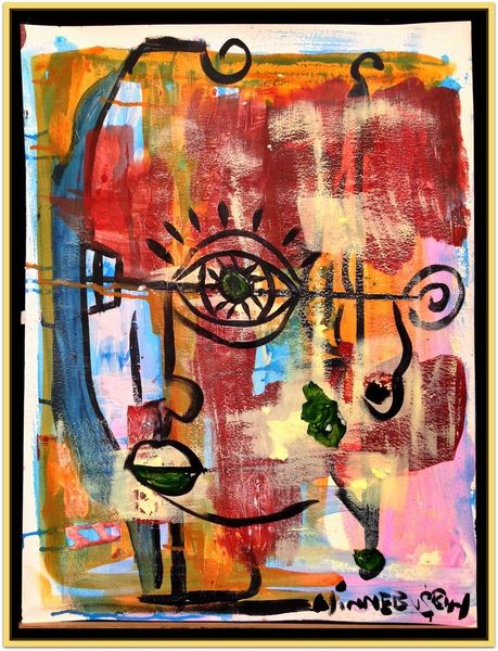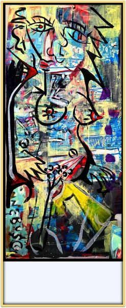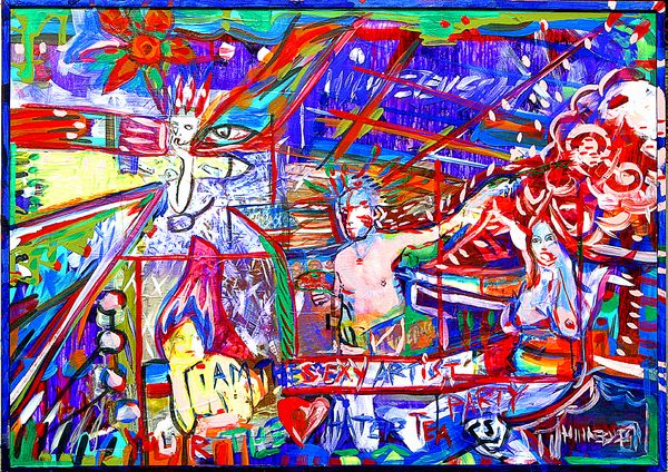 Curator: David Michael Hinnebusch's "Vernon S Place," created in 2017, is an intriguing piece rendered in mixed media, prominently featuring acrylic paint. It presents a bustling interior scene. Editor: My immediate reaction is… energetic chaos. The composition feels unstable, but the vibrancy of the color palette is undeniable. There's a push and pull between order and disorder. Curator: Exactly. Observe the application of the paint. There are deliberate strokes of color, consider how Hinnebusch uses broad strokes and layering. The structural lines try to give some kind of order to the painting, they converge towards the people gathered at a table, offering us some semblance of spatial arrangement, while it all comes to be very fragmented at the same time. Editor: Yes, that structure does give a feeling of order! And the table gathering calls forth images of domestic rituals. Food has always symbolized family and community, across countless cultures. Do you see how he depicts everyone around that central area? Curator: Note also, the graffiti elements and how the work touches upon Abstract Expressionism in parts of its execution; this combination seems intentional. Hinnebusch also pushes figuration in ways we can’t necessarily name but are made fully aware of within this piece, playing on his mastery and subversion of all those genres. Editor: Precisely. It feels deeply contemporary while borrowing from a rich visual language. This makes me think about liminal spaces in urban living—moments of connection amidst anonymity, chaos, the symbolism and meaning that the everyday life imbues in us, almost inadvertently. Curator: It’s precisely this tension that grants “Vernon S Place” its powerful character. The way different techniques converge in a seemingly unstructured form to create the reality it wants us to acknowledge as palpable and urgent. Editor: An energetic encapsulation of a moment in time, filtered through Hinnebusch’s distinct perspective and style, so charged and direct, full of a deeper resonance through everyday images of people together at a table.