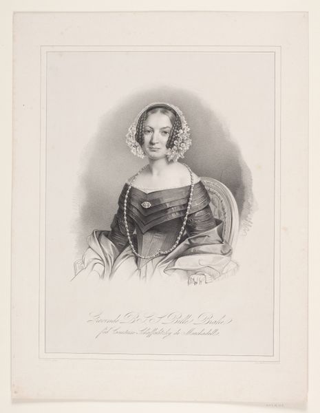 Curator: This is a lithograph, simply titled "Amalie Rieffel," created in the 1840s by Emil Ditlev Bærentzen. Editor: My first thought is how delicate the linework is! It’s almost as if the subject might float right off the paper. There's an incredible fragility here. Curator: It's a beautiful example of early lithography’s role in portraiture. Think about the accessibility it offered! This print democratized image-making, making portraits available beyond the wealthy elite. Editor: Absolutely. Lithography provided a way to disseminate likeness, but what fascinates me is the material reality: the artist carefully building the image through layers of grease and ink on stone. It seems almost contradictory that something so seemingly heavy produced a piece that appears to be light and ephemeral. Curator: Right, and in that period, portraiture held such societal weight. A likeness wasn't just a representation; it signified social standing and connections. Bærentzen was a significant figure in Copenhagen’s artistic scene. His work provides insights into the networks and values of the burgeoning middle class. Editor: I agree, yet there is more to it than her social standing. It is also about the labor, the means of creation, and how printing shapes access to images. Her gaze, the set of her jaw… these all translate to print via the worker's hands, who prepared the plate for the run. Consider, too, that Bærentzen had a business producing these images! Curator: I find the gaze really telling. There's a quiet self-possession that speaks volumes about the sitter's role within her society. You can sense her awareness of being portrayed, carefully constructed by both her and the artist. The print is currently located at the SMK, Statens Museum for Kunst. Editor: I keep circling back to the handmade quality within a mechanised process. The delicate shading almost camouflages the mechanised work in printing many copies, revealing its labor through lithographic practice. It allows me to reconsider where this delicate balance between process and representation positions the print within the social and material world. Curator: It's this intersection of personal expression, accessible reproduction, and societal context that makes "Amalie Rieffel" so compelling. Editor: It gives us such a tangible example of the subtle ways even “commercial” artwork still bears its social and material connections in every impression!