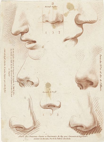 Editor: Here we have "Studieblad met voorbeelden van ogen", a study sheet with eye examples by Gilles Demarteau, created sometime between 1732 and 1776. It's a drawing or print, seemingly in pen. I find the collection of eyes fascinating – almost like a typological study. How would you interpret this work, particularly within its historical context? Curator: This print provides a fascinating window into the academic art world of the 18th century. Prints like this circulated widely, playing a crucial role in disseminating artistic knowledge. We should think about who Demarteau was and who was his audience. His status as a printmaker "Pensionnaire du Roy" is important. What does this reveal about art's institutional support and the control mechanisms in place? Editor: So, you're saying that instead of just seeing a simple drawing lesson, we should also consider this sheet's place within the official artistic system? Curator: Exactly. Notice how the sheet includes French text that dictates the correct proportions and how each eye represents a phase or stage. What does the existence of such a print say about artistic training and expectations during this era? Were artists expected to strictly adhere to academic rules, or was there room for creative interpretation? It seems to codify how artists were instructed and also perhaps subtly constrains creative deviation. Editor: That makes a lot of sense! It highlights the relationship between art, education, and established power. I suppose that’s different from how artists learn today, perhaps more open, less centrally mandated… Curator: Precisely! Thinking about the museum or collection that might own such a work—what narrative are *they* hoping to build through it, I wonder? Editor: This conversation has opened my eyes – no pun intended! I now realize the sheet offers insights into both artistic technique and the socio-political dynamics that shape art creation. Curator: Indeed! It serves as a reminder that artworks are never created in a vacuum.