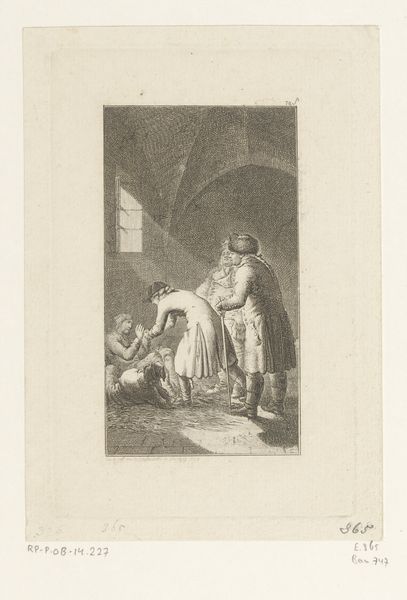 Louis Michel Halbou created this etching, "Boereninterieur met twee figuren bij een schouw en een man in een deuropening," sometime in the 18th century. Notice the central figure, a man casually seated, his posture conveying nonchalance or perhaps inebriation. This pose echoes through time, resonating with images of Bacchus, the Roman god of wine and revelry. Consider how the relaxed, almost limp posture embodies a state of abandon, a temporary release from societal constraints. We see similar poses throughout art history: from ancient sculptures of Dionysus to Renaissance paintings of lounging figures. The symbolism shifts, yet the core idea of release remains. This connection invites us to ponder how these images tap into collective memories. Halbou's interior scene presents us with everyday life, yet it is imbued with a sense of timeless human experiences. The echoes of Bacchus are a reminder of how deeply ingrained the pursuit of pleasure and freedom are within our cultural psyche. The image, therefore, is not merely a snapshot but a conduit for the subconscious recognition of past echoes.