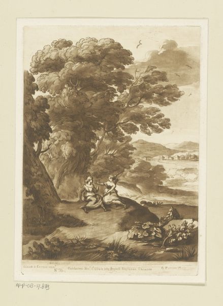 Crescenzio Onofri’s etching, "The Withered Tree," captures a landscape in delicate lines, likely created in the late 17th or early 18th century. The monochromatic palette focuses attention on the structural elements within the composition. The artist uses line to create tonal variations. The texture is rendered through dense cross-hatching in the foreground, which gradually lightens towards the distant, smoky mountains. This is achieved by varying the proximity of lines to one another. The barren tree dominates the composition, its form twisted as it echoes the ruggedness of the landscape. Considered from a semiotic viewpoint, the withered tree and tumultuous sky might function as signs pointing beyond their literal representation. They may hint at themes of decay, transformation, and the sublime power of nature that destabilizes established meanings about life.