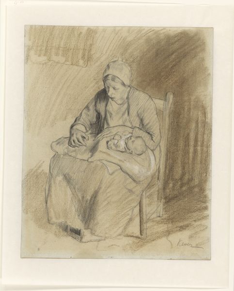 Curator: Here we have a pencil drawing from between 1873 and 1932, titled "Kind van Wilhelmus Johannes Steenhoff aan de borst van zijn moeder," which translates to "Child of Wilhelmus Johannes Steenhoff at his Mother's Breast." It's currently housed at the Rijksmuseum. Editor: It has this incredibly tender and almost fragile feel, doesn’t it? The delicate lines really capture the intimacy of the moment. Curator: Indeed. Note the composition – the mother and child are positioned centrally, almost filling the picture plane. This compositional choice immediately draws our eye and directs our focus entirely on their shared space. Also, observe the economy of the line, the sheer art of suggestion rather than concrete description. It has a symbolic and emotional depth that moves beyond a representational likeness. Editor: And you really sense the hand of the artist, don't you? It’s clearly a sketch, a work in progress, evidenced by the toned paper showing through. You can almost trace the artist’s movements, his process of building up the image. Look at how the softness of the pencil creates a gentle atmosphere, perfectly mirroring the bond it depicts. How was the work likely circulated, how many studies preceded it and by what labor was this family supported? Curator: The drawing operates on a deeply psychological level, don't you agree? It evokes thoughts of motherhood and vulnerability using minimal means and the image itself is so universally recognizable, like an archetypal scene that transcends its specific context. Editor: Precisely. I appreciate the rough and unfinished texture—it is more a record of its production than it is anything else, showing the artist grappling with the reality of maternal connection and the very labour required for that connection, turning the paper into something tender but fundamentally made by physical efforts and time. Curator: Thinking about Steenhoff’s other work, you begin to see how his formalism is actually rather modern. It’s a beautiful, economical distillation of pure emotion into line and form. Editor: Yes, it offers such a stark contrast between subject matter and the raw evidence of its handmade origins, and it compels us to remember it’s the means and process of material artistic endeavor we must attend to. Thank you.