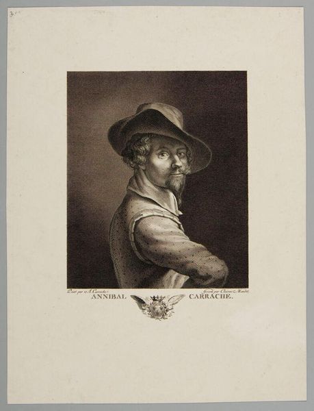 Editor: So, this is "Annibale Carracci" by E. J. Glairon-Mondet at the Harvard Art Museums, a small print. There's a real dramatic flair to the lighting. What's your read on its historical context? Curator: The inscription tells us a lot. It references the Palais Egalité, formerly the Palais Royal, suggesting it was made during or after the French Revolution when notions of equality were being publicly promoted. Editor: Interesting! So, this image, though depicting an Italian artist, was circulating within a specific political climate in France? Curator: Precisely! The "École de Lombardie" further emphasizes a regional artistic identity, aligning Carracci with a particular lineage valued in that moment. It's about claiming cultural heritage within a revolutionary context. Editor: I hadn't considered the political implications of that inscription. Thanks! Curator: My pleasure. Thinking about the public role of art really shifts our perspective.