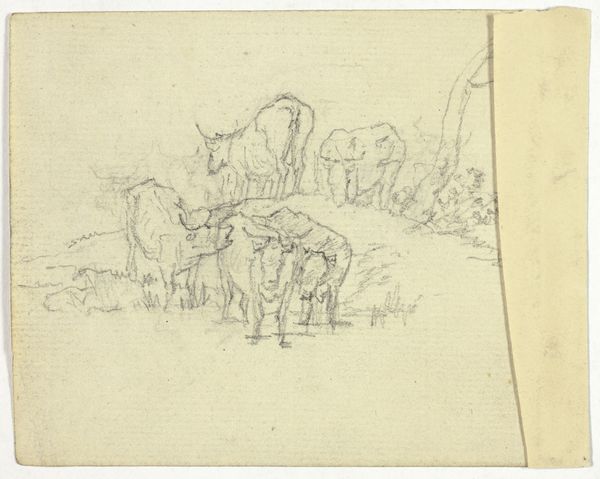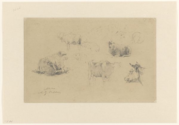 Curator: Alright, let’s delve into Théodore Géricault’s “Sketches of Goats,” dating back to 1813-1814. It’s a pencil and graphite drawing on paper, currently residing here at the Art Institute of Chicago. What are your initial thoughts? Editor: The page reads as an informal arrangement of goat life. It's got a scattered, sketchbook energy... A very immediate and tactile visual experience! Curator: Absolutely. The sketch-like quality is central. Notice the different poses and groupings—they show Géricault exploring the anatomy and movement of the animals. It’s all about capturing raw form. Editor: Yes, look how economical the strokes are. There's almost no shading or filling. More of a gestural study that communicates depth by hatching and line weight variation, reminiscent of something he might find in a Delacroix, right? Curator: Indeed, but perhaps more immediate, less refined than Delacroix sometimes gets. You know, Géricault was so obsessed with realism and emotion; maybe this obsession can be seen through how carefully the goats are outlined. They feel solid even when only sketched briefly. I wonder if it was the Romantics, who admired direct and intense studies of nature. Editor: Speaking of directness, consider the composition as a whole. How might this scattering of sketches break the frame that formally orders the work? Curator: Well, Géricault rejects any academic sensibility with that—no traditional framing, no hierarchy of importance. It almost feels like a collection of thoughts rather than a polished, finished piece. What might we speculate Géricault thinks when we see it as an insight into his process. I'm not too certain. What is sure, it definitely offers more than just the surface sketches; it invites us into Géricault's artistic process, that part always remains elusive. Editor: True enough, this piece feels more like an intimate glimpse into the artist's observation than some type of definitive artistic statement on 'Goat-ness'. It really asks us to focus on line, form, and immediacy. Well, it seems Géricault gives us so much to think about! Curator: Couldn’t agree more. An unpretentious yet fascinating peek into the work and thought of Géricault.