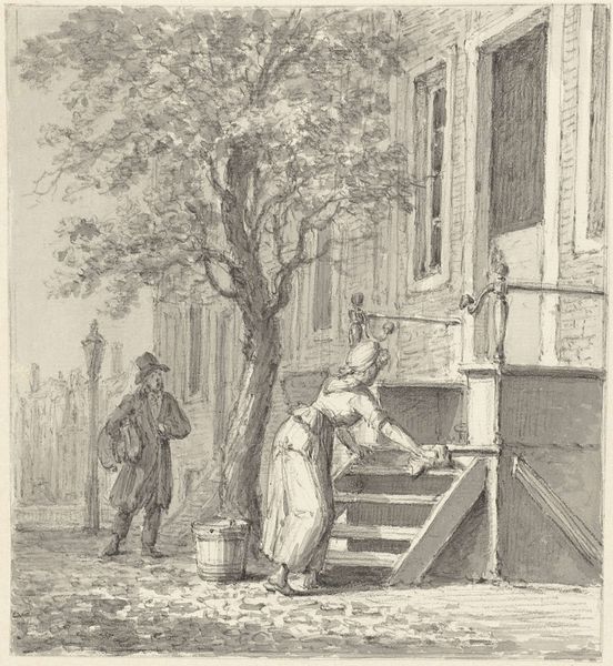 This drawing, Man Behind a Tree Spying on a Couple, was created by Willem Steelink, using pen and brush in grey ink. The grey ink washes create the drawing's tonal range, and you can see the artist's hand at work in the careful application of the ink. Steelink's technique emphasizes the image's narrative tension, with the fluidity of the ink lending an atmospheric quality to the scene. The social context of the artwork is reflected in the subject matter, which depicts a voyeuristic scenario hinting at intrigue. The monochromatic medium underscores the somber mood, while the swift strokes and subtle gradations of grey reveal the artist's mastery in translating form and emotion through humble materials. This challenges any assumptions about the inherent superiority of color.