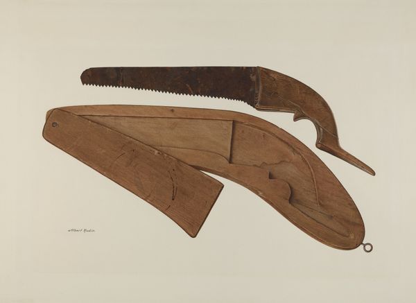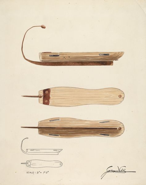 Curator: Here we have Wellington Blewett’s watercolor drawing, "Bishop Hill: Mangle," circa 1936. Editor: There's an immediate rustic charm. It's very subdued in color but something about it...it’s meditative. Almost zen. Two oblong blocks, each with carved-out grips as if to ask, "Lift me." Curator: The composition is deliberately simple. Two meticulously rendered views of the titular mangle component, isolated against a pale background. Notice the precision in the depiction of the wood grain; the interplay of light and shadow gives them a palpable, almost tactile presence. Editor: I see the wood grain now; beautiful, subtle, almost feels like a topographic map or tiny valleys in the palms of my hands, yes, a visceral, tactile echo—but then to see the handle shapes... it evokes labor and wear but maybe I am imposing too much feeling on it. Curator: The "Mangle" refers to a tool used historically for ironing or pressing cloth. These wooden forms represent functional beauty born out of necessity. It's a study of the inherent formal properties found in everyday objects, a pure semiotic exercise on function dictating form. Editor: Precisely. And while that might sound cold or analytical, for me it’s also tinged with nostalgia. Remembering a simpler time where function was also celebrated through artful design. The little wood grain valley details speak of simpler technologies and how those impacted daily life and the environment, and how we related to the work itself. I can even hear echoes of someone rolling it…shhhhh… Curator: That personal reading is valid but consider how Blewett is isolating this form and allowing its internal structure to dominate. How the play of horizontal planes guides our view and controls our optical reading… Editor: Yes! It is lovely how this very act also draws one into pondering the tactile element and almost the burden of repetitive motion involved in smoothing and caring for fabrics. In essence, it transforms the overlooked into something worthy of study and elevates the act of "doing". Curator: I concur and admire Blewett's masterful handling of watercolor to spotlight those details and subtle structural qualities, indeed turning it into something quietly profound, even stoic in its simplicity. Editor: In short, from the formal grace in structure to this beautiful wooden artifact rendered as meditation. Yes! Worthy of contemplation.