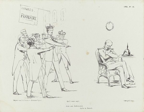 This is Johan Michaël Schmidt Crans’s "Political cartoon on voters and candidates", made in 1862. The Dutch political landscape of the mid-19th century was marked by debates over constitutional reform and electoral processes, which provided fertile ground for satirical commentary. The print depicts a crowd of men, presumably voters and candidates, in a state of disarray. Some carry banners with conflicting slogans like "Order without Freedom" and "Freedom without Order," capturing the ideological clashes of the time. The phrase "Law in reverse" gives us a feeling of regression and backwardness. The artist cleverly uses visual metaphor to critique the political climate. Schmidt Crans comments on the complexities and contradictions inherent in the electoral process, offering a glimpse into the anxieties and aspirations of Dutch society during a period of political change. The cartoon reflects the emotional and personal dimensions of political engagement and the ongoing struggle to reconcile conflicting values in the pursuit of progress.
