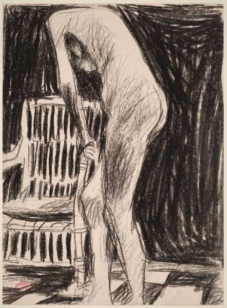 Editor: Here we have Paul-Albert Besnard’s etching from 1900, "After the Visit". The skeletal figure is so stark against the implied forms in the background. It's…melancholy, I think. How would you interpret this piece? Curator: For me, it's critical to look at the processes and materials Besnard employed here. Etching allowed for mass production, making this image accessible. But who was the target audience? Consider the late 19th-century rise of industrial capitalism and its impact on society, perhaps prompting anxieties about mortality reflected in these images of skeletons and grief. Editor: So, the material process itself informed the subject? Curator: Precisely! The affordability of prints meant wider circulation of these memento mori. Etching wasn’t as prized as painting, blurring lines between high art and accessible design, influencing its potential meaning for viewers confronting rapid social and economic shifts. Notice the linear quality; think about its impact on the perceived emotional content, versus something painterly. Editor: It almost feels… clinical, because of the lines and the medium. And the way mass production diminishes something deeply personal like grief... Curator: What labour went into its making? How might repetitive production have influenced the artist’s own understanding, their relationship with mortality? This also challenges typical art hierarchies, doesn't it? Editor: Absolutely. I'd never considered that the means of production could be so intrinsic to interpreting its emotional core! Curator: Understanding materiality reveals art's deeper dialogue with its time. The work involved shifts our focus away from purely aesthetic judgements and illuminates production and labor.