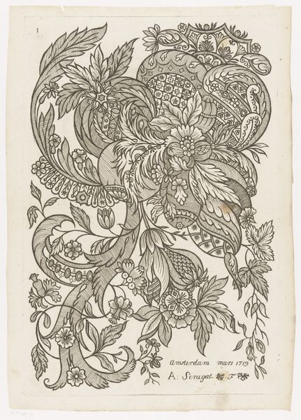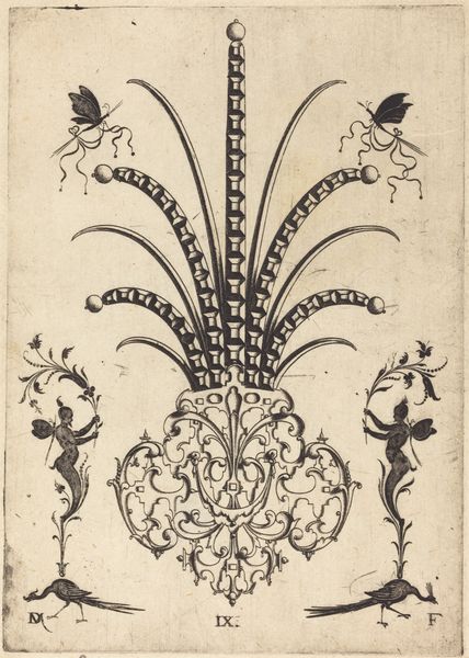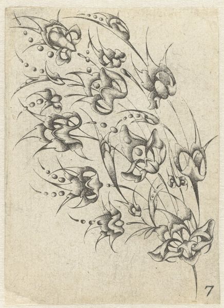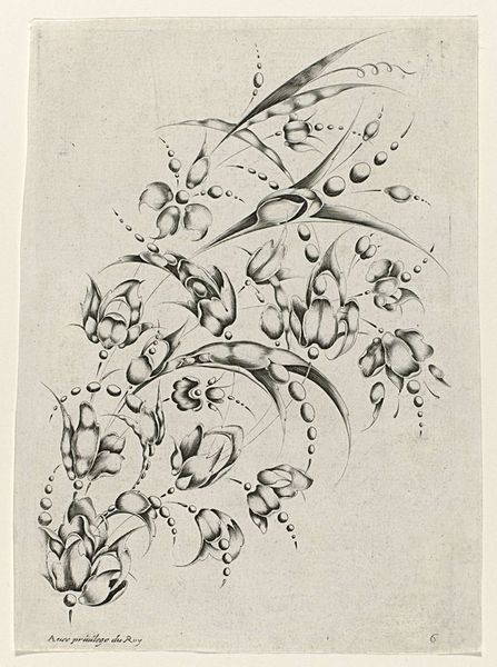 Curator: Here we have a work titled "Calligraphic Flowers" by Joseph Jean Bernard, rendered with a pen using blue ink drawing on toned paper. Editor: Well, hello there, delicate whimsy! It feels like looking at a page from a fantastical botanical study, maybe by a particularly imaginative Victorian scribe. So ornate. Curator: The medium emphasizes line and form over color. The artist really embraces the graphic possibilities here. Look at how the varying line weights and patterns create texture and depth. Editor: Absolutely. The entire composition, down to the looping embellishments suggesting a vase, leans into ornamentation, practically dancing on the paper! Is it trying to evoke old engraving styles? It’s rather captivating. Curator: It shares qualities of sketchbook art, resembling perhaps initial explorations. Considering its aesthetic relationship to "old engraving style," it makes me wonder about the accessibility of materials and training available to the artist, as well as the artistic communities this artist may have had exposure to. Editor: I imagine him carefully crafting each swirl and curve, perhaps in a sun-drenched studio filled with oddities. There’s a delightful blend of precision and improvisation in his mark-making that feels rather soothing. A good remedy for our digital age, wouldn't you say? Curator: Exactly, these qualities encourage speculation about both the artist's practice and contemporary production. Editor: This piece inspires me to take a break from the screen and try my hand at a little pen-and-ink daydreaming! How about you? Curator: Precisely. It gives me pause to reevaluate assumptions regarding historical modes of material practices versus those considered "high art."