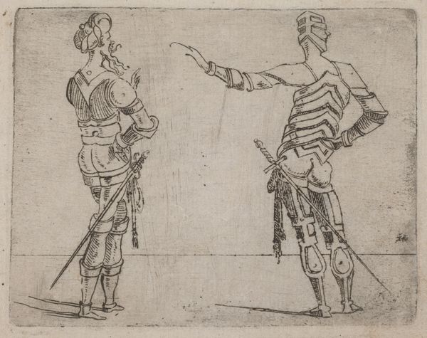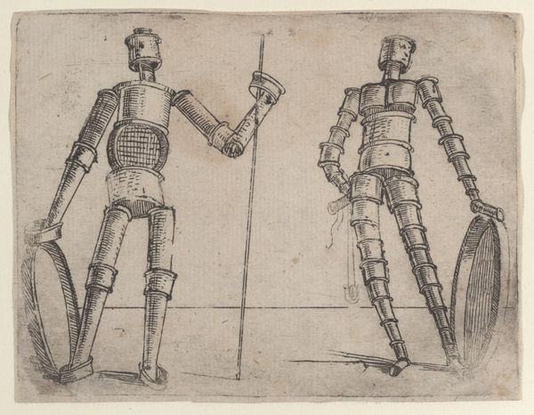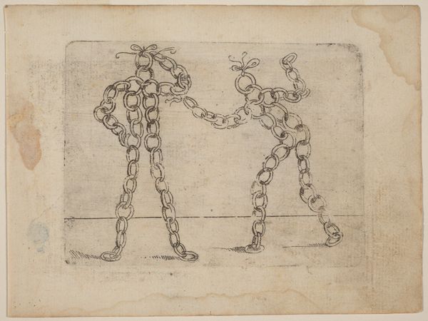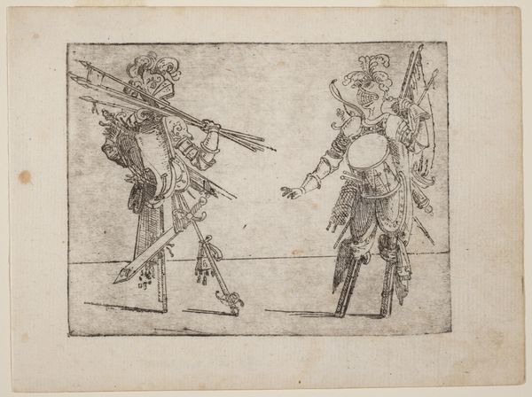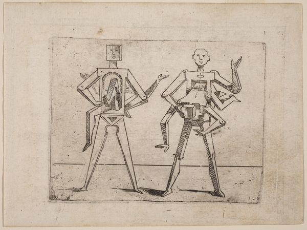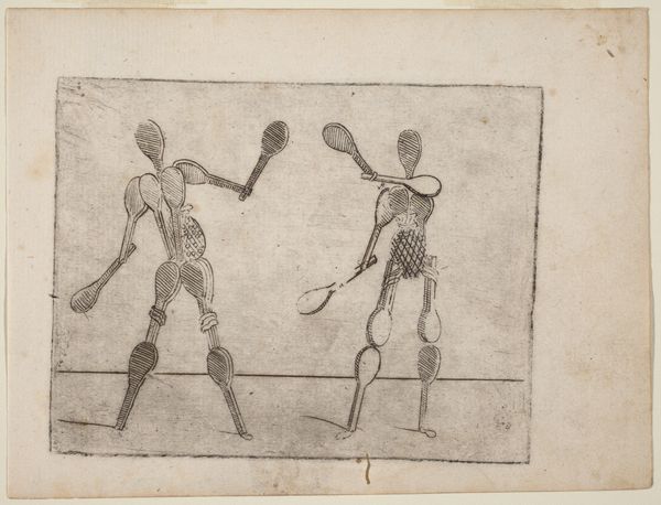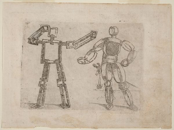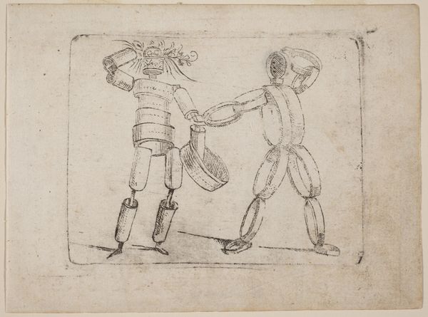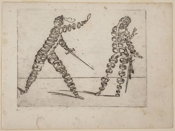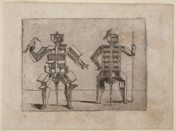 Curator: Here we have Giovanni Battista Bracelli's etching, "From 'Bizzarie di varie Figure'," created in 1624. It's an intriguing example of Mannerist printmaking. Editor: My immediate reaction is... unsettling playfulness. There's something quite uncanny about these constructed figures, a real tension between the grotesque and the humorous. Curator: Absolutely. Bracelli masterfully utilizes line and form here. Notice how the figures are constructed from disparate, almost architectural elements, lending them a disjointed yet strangely harmonious structure. The articulation of each form is deliberate, contributing to the overall composition. Editor: And what about the implications of representing human-like forms in this way? To me, this resonates with the social anxieties of the era. The Thirty Years' War was raging—a time of intense upheaval. Are these figures, assembled from fragmented parts, a reflection of a fragmented society, dehumanized by conflict? Curator: That's a compelling reading. Formally, one could argue that Bracelli is exploring the very nature of representation. He's dissecting the human form and reassembling it according to an internal logic, almost as if he's playing with the alphabet of visual language. The ambiguity between body and artifice really shines. Editor: True. Yet the "bizzarie"—the oddities—invite further interrogation. These figures, seemingly engaged in some unknown activity with a ball, suggest a distortion of power relations. What does it mean to depict humanity through this lens of mechanical absurdity? Are these the cogs of war? The playthings of some aristocratic elite? The complete disregard of common labor and social conditions is quite overt. Curator: Perhaps, but it’s also a display of the artist's virtuosity. See how Bracelli renders depth and volume purely through etching? The contrasting values and textures create a surprisingly tangible presence. Also, there are references to classical forms—a nod to artistic traditions—while simultaneously subverting them through playful deconstruction. Editor: Ultimately, this piece feels profoundly relevant today. We still grapple with bodies mediated through technological constructs and fractured realities, while disparities continue to widen. Curator: A timeless piece. Thank you for those considerations, hopefully this gives a perspective on a work that reveals new layers each time.
